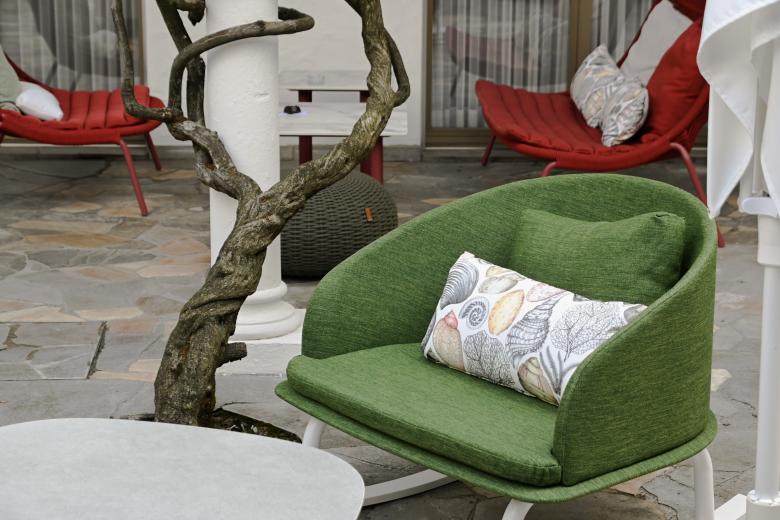Die Aussenlounge im Innenhof haben wir mit Talenti Möbel ausgestattet, welche von The Chair geliefert wurden. Die einladende und bequeme Lounge bietet den Hotelgästen eine gemütliche Rückzugsmöglichkeit. Die dezente Beleuchtung schafft ein romantisches Ambiente am Abend.
