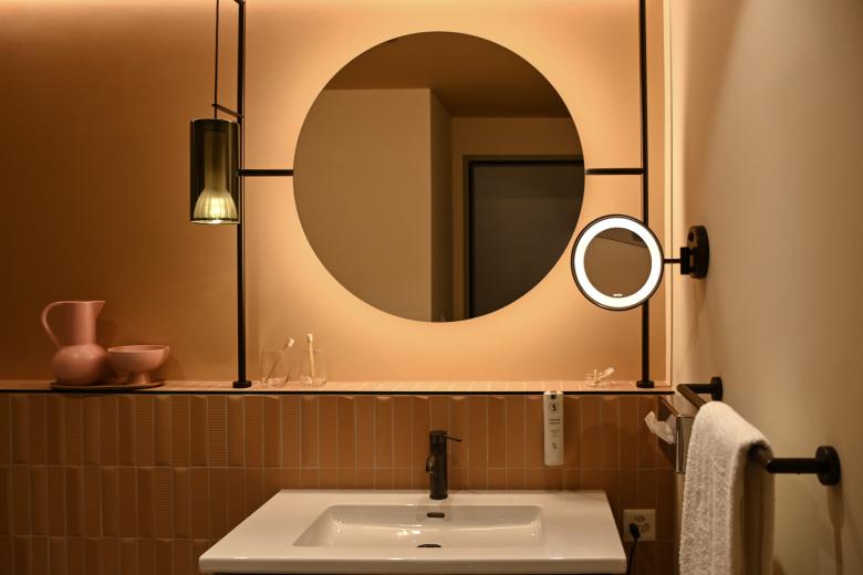 Bei der Sanierung der Badezimmer wurden wir von der mediterranen Umgebung des Hotels inspiriert. Die Materialisierung und das Farbkonzept sollen die vorhandene Atmosphäre des Hotels unterstreichen. Terrakotta als Symbol der römischen Keramik haben wir in den modernen, geometrischen Fliesen neu interpretiert. Die filigranen Metallprofile der neuen Möbelelemente und die indirekte Beleuchtung erzeugen eine schwebende Wirkung im Badezimmer.