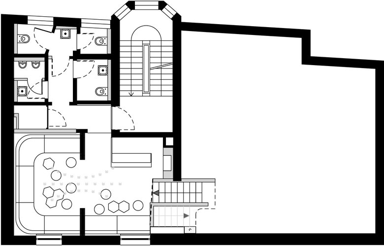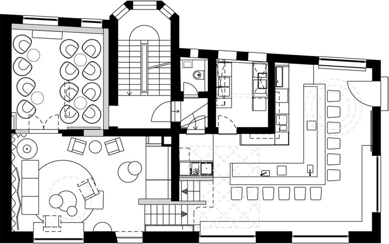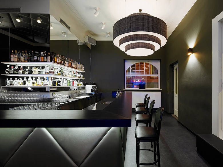 Fallfenster. Im Sommer kann die Bar so weit geöffnet werden und den Barbetrieb auch im Außenbereich fortsetzen. Entlang der Außenwand verläuft durch den Barbereich eine durchgehende Bank, sodass der begrenzte Raum maximal ausgenutzt wird. Das hintere Ende des Raums führt zu einer neu eingebauten Treppe. Das skulpturale, schwarze Element fungiert als Gelenk und leitet jeweils eine halbe Etage nach oben und unten.