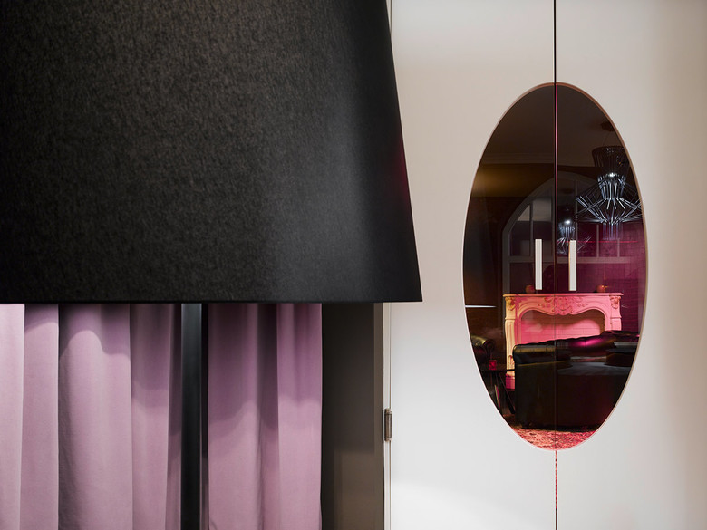 Eine Etage tiefer befindet sich ein weiterer Salon mit einem aufgearbeiteten alten Holzboden. Dieser ist mit schwarzen historisierenden Möbeln und modernen Elementen in einem metallischen Bronzeton ausgestattet. Die einzelnen Elemente sind zu ineinander verschnitten Ensembles angeordnet. Den Raumhintergrund bildet ein mauvefarbener schwerer Vorhang, der durch eine große Stehleuchte komplementiert wird. Eine Doppelschwingtür mit ovalem Glasfeld führt von hier hinüber in die Raucherlounge. Für den lasterhaften Genuss sorgt ein entsprechendes dunkles Ambiente. Der Raum ist mit einer dunkelbraunen Krokoledertapete ausgeschlagen und vor dem offenen Kamin warten schwere, chesterfieldgepolsterte Sessel.