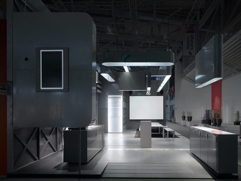 Die Elemente des Messestandes der Bundesarchitektenkammer stammen mehrheitlich aus dem „Wegwerf-Lager“ eines Messebauers mit ausgemusterten Resten unterschiedlicher Messestände. Denn jedes wieder verwertete Teil bedeutet weniger Energie- und Ressourcenverbrauch – und in diesem Falle auch minimierte Transportwege durch die zentrale Lagerung und Montage. Die einzelnen Bau-Elemente wurden entsprechend der Stand-Abmessungen und der vorgegebenen Funktionszonen in einer Art 3D-Puzzle kombiniert und mit ökologisch korrekten Farben homogenisiert. Der collagenartige Charakter des Messestandes sollte sichtbar bleiben, um den Recycling-Gedanken deutlich wahrnehmbar zu präsentieren. Die Lichtplanung des Lichtlabors Bartenbach wurde mit geliehenen, teils gebrauchten und Energie-effizienten Halogen-Leuchten umgesetzt – Lichtintensität und Lichtfarbe entsprechen den unterschiedlichen Anforderungen der Nutzungsbereiche.