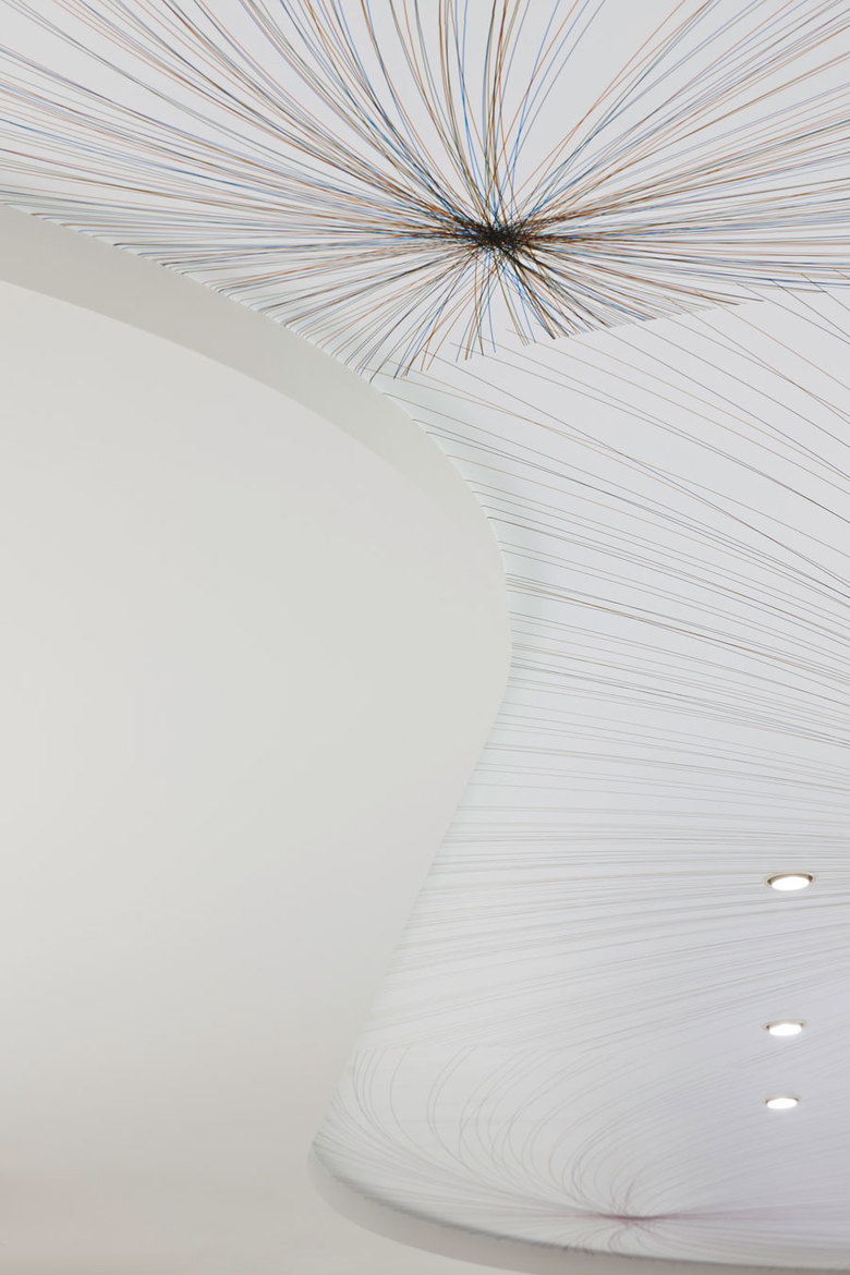 Um dieses neue Profil bereits von außen sichtbar zu machen, wurde im Zuge des Umbaus das gesamte Gebäude fassadensaniert. Die jetzt bis zum Boden durchgezogenen Fenster gewähren maximale Einsicht in das repräsentative Ladeninnere, das somit selbst zum Schaufenster wird. In die bestehenden Räumlichkeiten wurde weiterhin ein angrenzendes Geschäft integriert, sodass insgesamt ein langgestreckter Grundriss entstanden ist. Der Raum öffnet sich an zwei Seiten zur Fußgängerzone hin. Beide Eingänge führen auf den zentralen Tresen zu, der den Mittelpunkt des Raumes markiert. Die rückwärtige Wand geht fließend über in die Decke, die nach oben zurückspringt. Auf diese Weise werden Bewegungs- und Beratungsbereich voneinander differenziert und die beiden Zugänge miteinander verbunden. Den zurückgesetzten Deckenbereich pointiert eine feine Linienstruktur in subtiler Farbigkeit aus Braun-, Lila- und Blautönen, die Assoziationen zum Verlauf der Strahlen und dem Linienspiel der Iris herstellt.