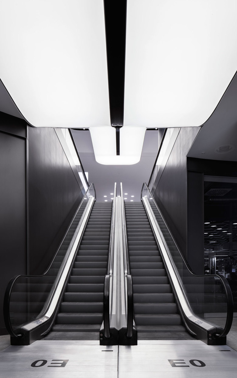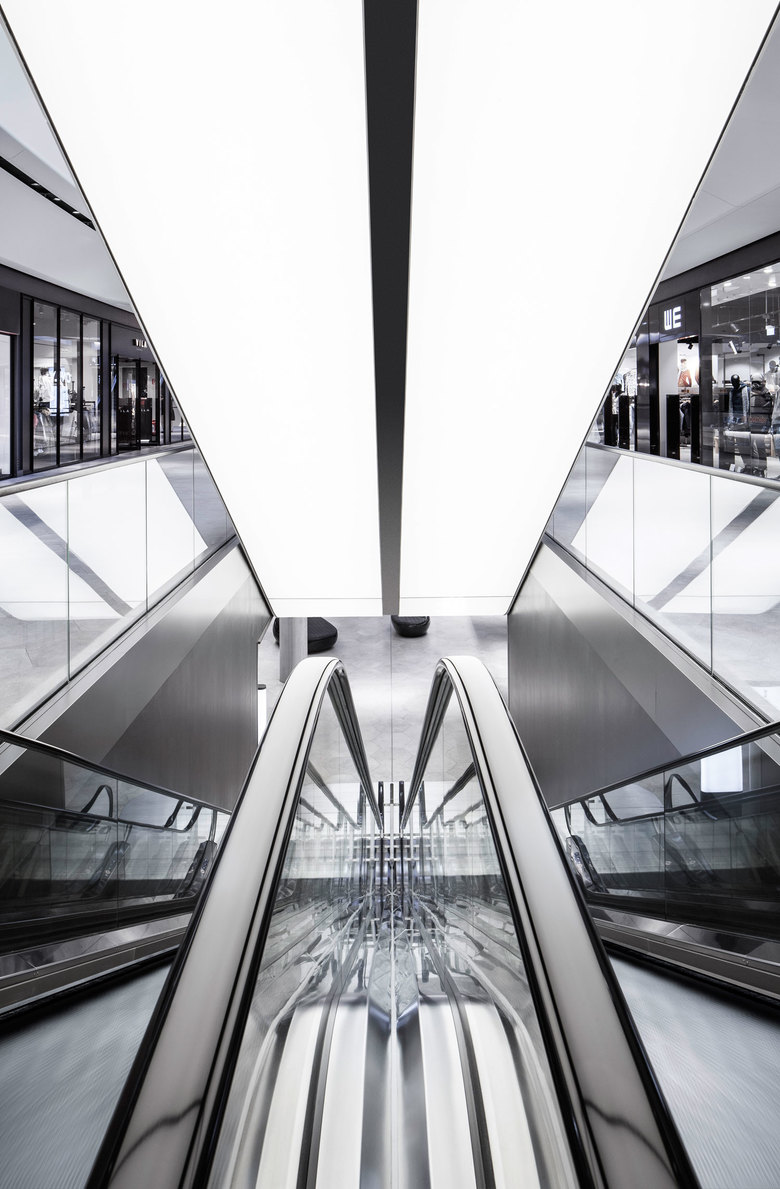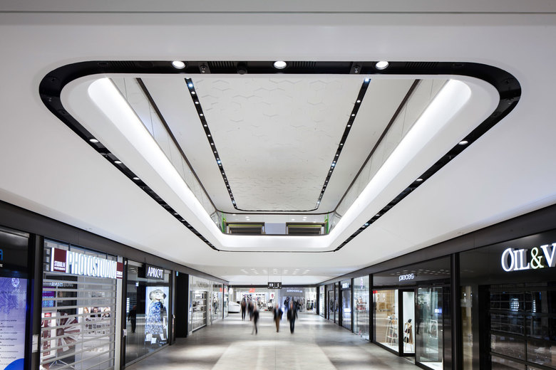 Durch die eingeschnittenen Lufträume entstehen Sichtbeziehungen zwischen den verschiedenen Ebenen der Mall. Abgerundete Decken und Brüstungen geben dem Raum eine fließende Erscheinung und betonen die Vertikale. Die gläsernen Geländer verschlanken die Deckenschichten zusätzlich, geben den Blick frei auf die Shopfassaden in anderen Geschossen und wecken die Neugierde, den Bummel dort fortzusetzen. Die monochrome Farbgebung der öffentlichen Bereiche verleiht diesen Eleganz. Gleichzeitig wird durch den Verzicht auf Farbe der visuelle Wettbewerb mit den Shopfassaden vermieden.