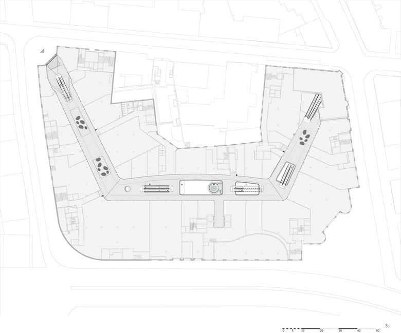 Der Zugang zu den öffentlichen Bereichen der Mall erfolgt über Eingänge an drei der vier Gebäudeecken. Durch ihre Lage an den Kreuzungen werden die Besucherströme aus den jeweiligen Straßen aufgenommen und in das Gebäude geleitet. Während die beiden Zugänge an der Tübinger Straße auf Erdgeschossniveau liegen, betritt man das GERBER von der Marienstraße aus eine Ebene höher. Aufgrund des Höhenunterschieds, aber auch durch den nichtlinearen Verlauf der Hauptwege innerhalb der Mall ist eine klare, präzise Besucherführung erforderlich.