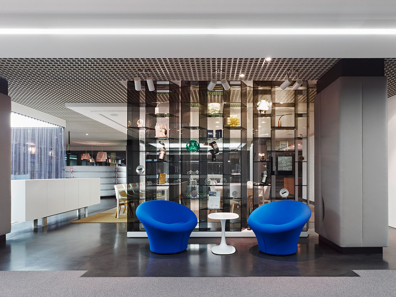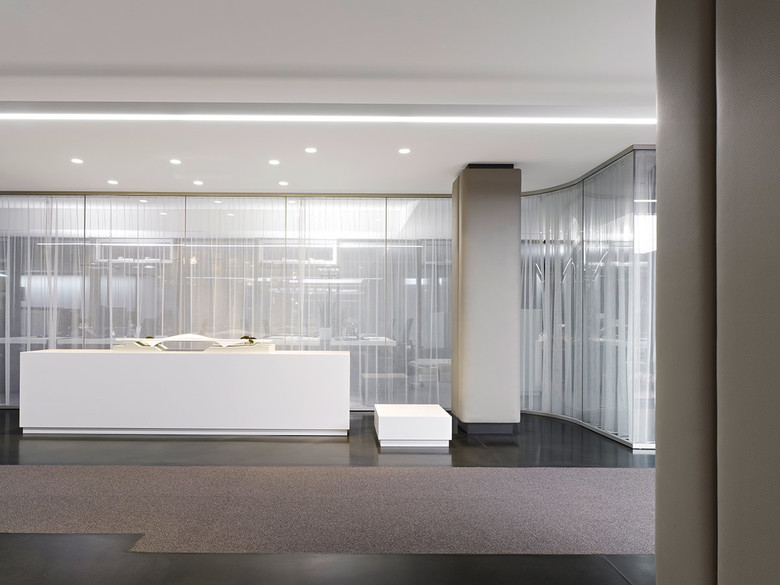 Besucher erreichen die erste Etage über eine freischwebende Treppe, die von SBP selbst konstruiert worden ist. Sie führt zum Empfang, von dem aus sich der Raum in einer choreografierten Perspektive öffnet. Flankiert wird er im ersten Teil von einer Aluminiumwand mit eingelassenen schwarzen Magnetbändern, die als Präsentationsflächen dienen. Am Empfang, hinter dem eine erste Bürozeile für Sekretariat und administrative Aufgaben angeordnet ist, beginnt ein Teppichband, das auf mineralisch beschichteten Estrich liegt und die Laufzonen markiert. Rückspringende Einschnitte im Teppich sind Wegweiser für die unterschiedlichen Funktionsbereiche des Raums. Ein aufgesetztes, 17 m langes Lichtband an der Decke gibt als Leitstrahl zusätzlich Orientierung.