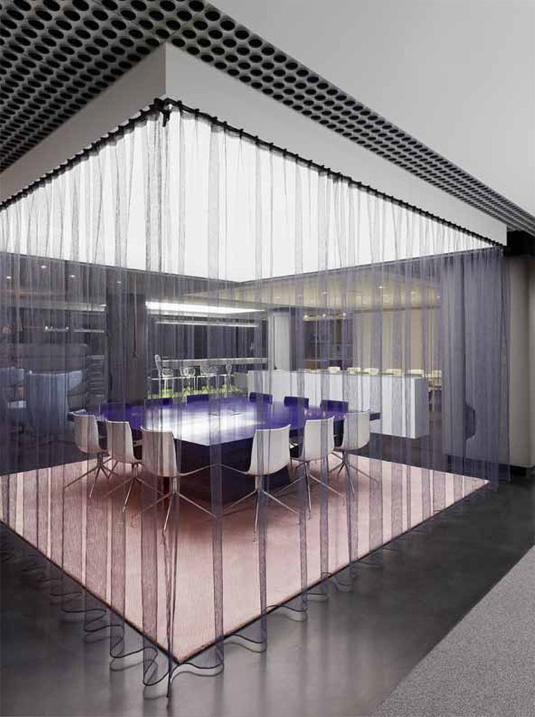 Das Zentrum bildet der große Essbereich mit zwei langen Tafeln und insgesamt 24 Sitzplätzen, die auf changierenden Teppichfliesen in drei unterschiedlichen Grau- und Brauntönen stehen. Darüber befindet sich ein abgehängtes Deckenfeld aus Akustikputz. Orthogonal zu den Tafeln schiebt sich ein Stehtresen wie ein optischer Riegel vor eine Gruppe aus kleinen Einzeltischen an der Fensterfront, die eine intimere Gesprächsatmosphäre bieten. Über diesen Tischen schwebt ein abgesetztes Lichtfeld. Das neongrüne Punktraster auf dem Boden stellt Assoziationen zu einer Wiese her und schafft so eine Überleitung zur Terrasse, die an einer Seite mit einer green wall abschließt. Zwischen Essbereich und Bibliothek bilden zwei behagliche Ohrensessel einen Rückzugs und Leseort. Beistelltischchen und drei langgezogene Lichttulpen unterstreichen den Wohnzimmercharakter. Daran schließt sich ein halbhoher Raum im Raum an: Ein Zylinder öffnet sich zur Terrasse hin und grenzt sich so vom Geschehen im Raum ab. Die akustisch wirksame Polsterung fördert hier das konzentrierte Gespräch, während der hochflorige Teppich, eine Lampengruppe und die Farbwelt in Bronze- und Rottönen eine behagliche Kaminatmosphäre schaffen. Den Gegenpol dazu bildet der quadratische Besprechungsbereich gegenüber, der durch das Lichtfeld an der Decke klar gefasst wird. Durch die nahezu transparenten Gitterstoffvorhänge wird dieser bewusst als halböffentlicher Bereich inszeniert. Frische Farben, der tiefblaue Tisch und ein rosafarbener Teppich versprühen hier inspirierende Lebendigkeit.