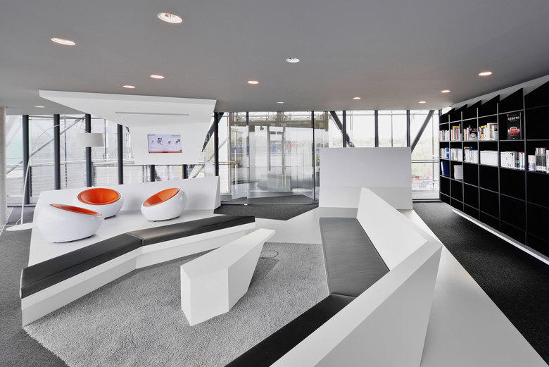 Dynamik und Bewegung kennzeichnen die Gestaltungselemente, die Angestellte und Besucher schon beim Eintritt in die großzügige Empfangshalle aufnehmen. Diese Elemente führen durch die offenen Arbeitszonen und die eigens eingerichtete Mitarbeiterbibliothek bis in den hauseigenen Fitnessbereich im 5. Obergeschoß mit faszinierendem Blick über Frankfurt. Polygonale Raumelemente und eine breit aufgefächerte Materialwelt stehen für den hohen gestalterischen Anspruch des Unternehmens selbst. Offene und transparente Arbeitsbereiche, gepaart mit halböffentlichen und diskreten Besprechungszonen fördern eine kreative und kommunikative Arbeitsatmosphäre.