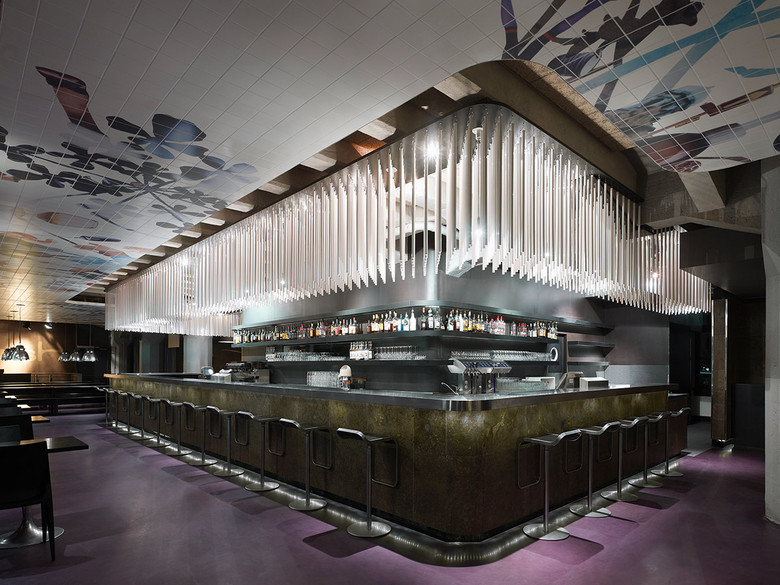Zunächst wurde der Raum neu organisiert. Die Bar wurde in den Mittelpunkt gerückt und zoniert so den langgestreckten großen Raum in drei übersichtliche Bereiche, die sich nun separat nutzen lassen und selbst noch einmal durch Fadenvorhänge abteilbar sind. Der Hauptbereich lässt sich so je nach Nutzung oder Veranstaltungsart in Größe und Wirkung stufenlos schalten und wirkt trotzdem immer intim. Die Rückwände in den Nischen sowie die Front des Tresens sind mit Muschelkalkplatten verkleidet, sodass sie in der Frontansicht eine durchgehende Fläche bilden. Der Muschelkalk wird durch Halogenlicht beleuchtet. Diese bringen dessen poröse Materialstruktur und Tiefe zur Wirkung und entfalten eine warmtonige, goldfarbene Lichtstimmung. Gleichzeitig wird so das Angebot der Bar besser inszeniert. Unterstützt wird dies durch 2500 einzeln abgehängte Kunststoffstäbe, in denen sich das Licht verführerisch verfängt.