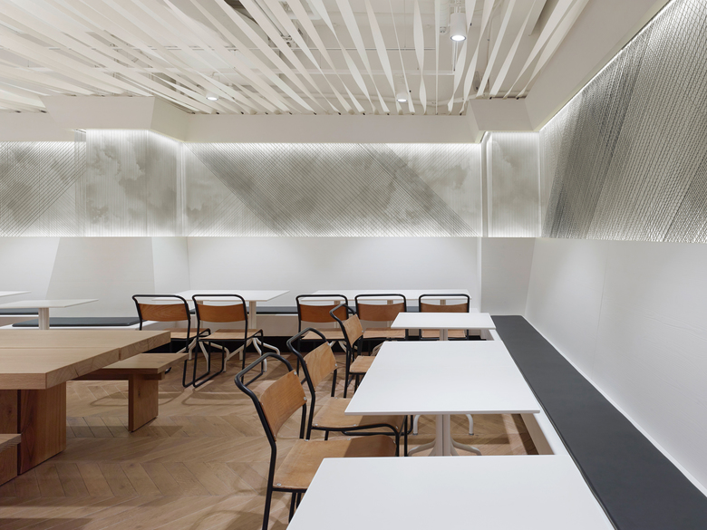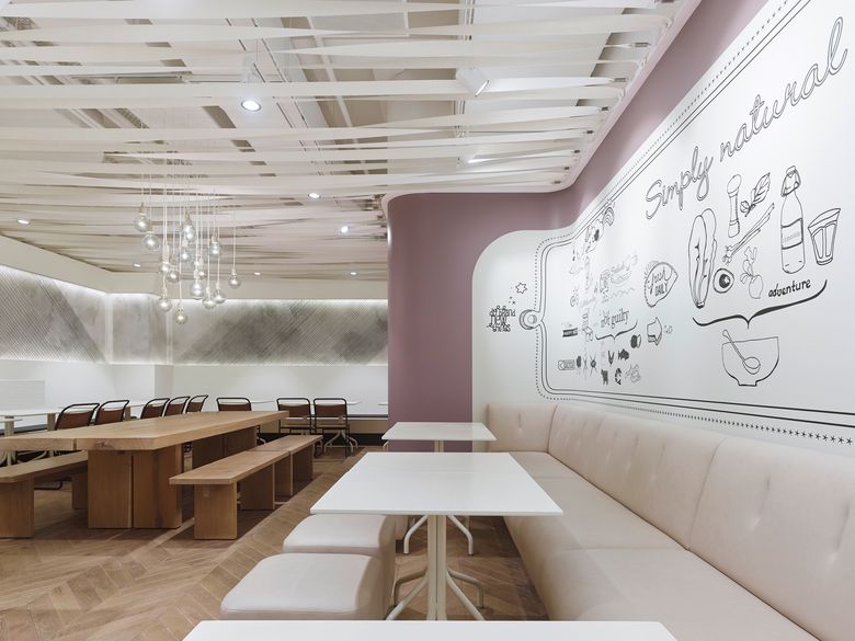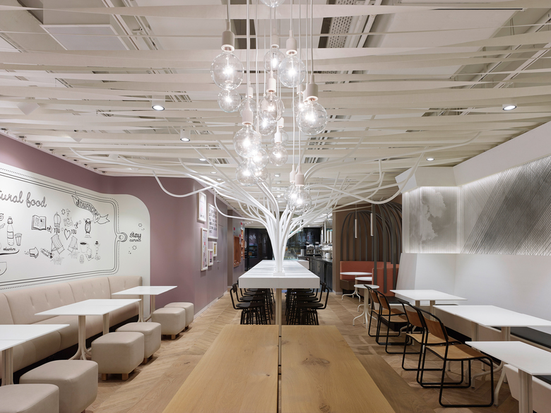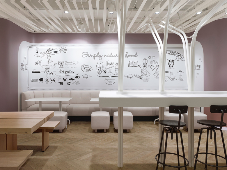 Einer Sogwirkung gleichkommend wird der Blick des Gastes schon von außen in den hinteren Teil des Restaurants geleitet. Hier erhebt sich der zentrale Hochtisch, getragen von bis unter die Decke mäandernden Bäumen aus weiß lackierten Stahlrohren und lädt zum unkomplizierten Sitzen ein. Daneben bietet der Gastraum außerdem ein differenziertes Sitzplatzangebot, das die Gäste je nach ihren Bedürfnissen nutzen können. Den Raum dominieren ungekünstelte Materialien die synonym für den Natürlichkeitsanspruch der Kette stehen. Verspielte Elemente und unerwartete Finessen wie die Bänderdecke aus Leinengurten und die Wolken-Faden-Grafik aus Hanfseilen spiegeln die Liebe zum Detail, die Leidenschaft und Offenheit der „not guilty-Familie“ wieder.