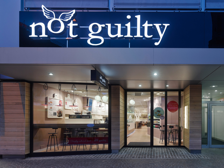 Die Schweizer Restaurantkette „not guilty“ steht für ehrliche Nahrungsmittel, die phantasievoll zu abwechslungsreichen Salaten und Snacks verarbeitet sind. Im Hinblick auf Expansion ist 2013 in der Innenstadt von Zürich der dritte Standort entstanden. In diesem Prototypen soll die Philosophie der „not guilty-Welt“- der „little heaven on Earth“, die Harmonie zur Natur und die Freude daran den Gast zum „Glücklich- sein“ zu inspirieren, erstmals auch gestalterisch umgesetzt werden. Der offene, längliche Raum empfängt den Gast mit vertraut wirkendem Eiche-Parkett und einer Mischung aus zarten Weiß- und Pastelltönen. Blickfang im Eingangsbereich bildet die Theke mit ihrer bunten Salatbar und dem als Küchenschrank stilisierten Menübord.