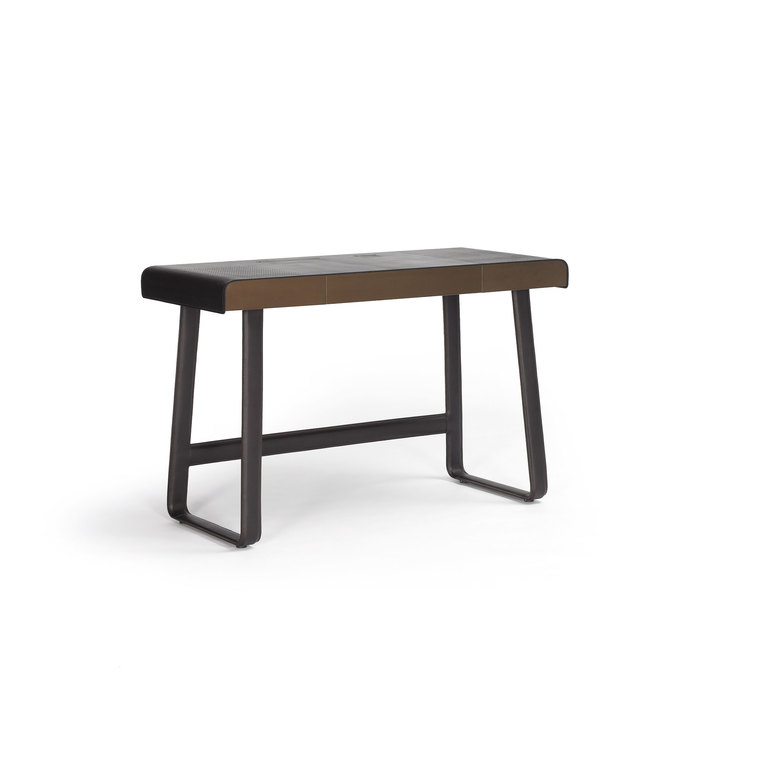Der Pegasus Home Desk ist ein kleiner, genial konzipierter Arbeitstisch für das Wohnumfeld, in dem alle digitalen Geräte ihren Platz finden, die längst Teil unseres Alltags geworden sind. Er verbindet eine durchdachte Arbeitsplatzlösung mit der Eleganz eines wohnlichen und handwerklich perfekt ausgeführten Möbelstücks. Die Oberfläche des Tisches aus starkem Kernleder lässt sich je nach Bedarf aufrollen oder umklappen, um darunter liegende Fächer freizugeben und den Zugriff auf eine intelligente Innenaufteilung zu ermöglichen. Hier finden Laptop, Tablet-PC, Mobiltelefon, Papier, Ladestationen, Stromversorgung oder weitere Accessoires ihren Platz. Ein feines Lochmuster in der Lederfläche ist nicht nur eine optisch interessante Struktur, sondern verweist auch auf die darunter verstauten Geräte und sorgt für zusätzliche Belüftung der entsprechenden Fächer. Wie bei einer funktionalen Satteltasche verschwinden sie im Inneren und sind doch gleichzeitig jederzeit schnell verfügbar. Der Pegasus Home Desk bringt Ordnung ins Chaos des digitalen Alltags und kontrastiert die Ästhetik der Technik mit der Materialität, Haptik und Verarbeitungsqualität aus der handwerklichen Welt der Sattler und Täschner.