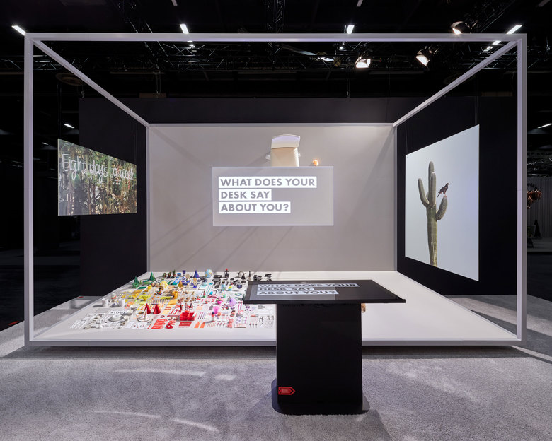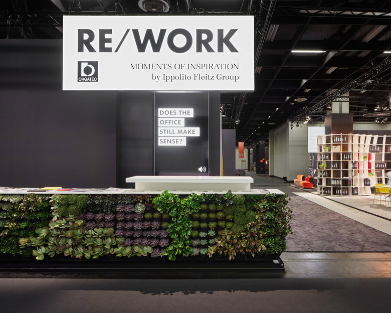 Während die Messeaussteller fertige Produkte und Konzepte präsentieren, sind wir während der ORGATEC die Fragesteller. „Does the office still make sense?“ war die grundsätzliche Frage, die Ausgangspunkt für unser Konzept war. Die Frage beantworten wir mit einem eindeutigen JA. Der Raum ist das reale Gegengewicht zu den digitalen Techniken, die unsere Arbeitsabläufe mehr und mehr dominieren. Er ist und bleibt der Identitätsstifter, über den die Identifikation mit dem Arbeitgeber und dem eigenen Tun stattfindet. Für RE/WORK haben wir elf Orte, Situationen und Kommunikationsszenarien gestaltet. Die Ausstellung entstand in enger Zusammenarbeit mit unserem Technikpartner zgoll: Konferenzraum.