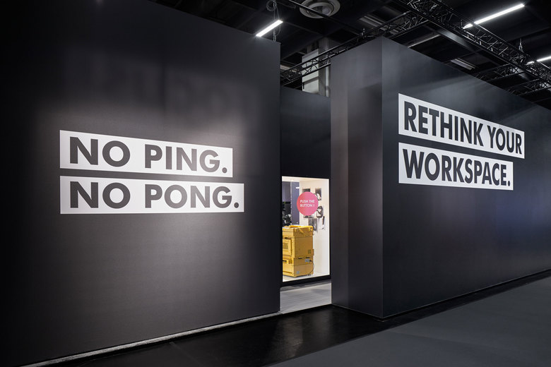 Unsere Einladung zum Denken leiten wir mit ironischen Statements und Fragen ein, die großformatig auf die Wandbespannungen der Standfassaden aufgedruckt sind. „No Ping. No Pong.“ Die Claims haben wir gemeinsam mit dem FRAME Magazin entwickelt, die Rahmensysteme stammen von Octanorm. Die einzelnen Szenen auf dem Stand werden über unterschiedliche Bodenmaterialien zoniert. Die dabei eingesetzten Teppiche kommen von Object Carpet, die Kunststoffgewebe von 2tec2 und das Messebodensystem von Expomobil.