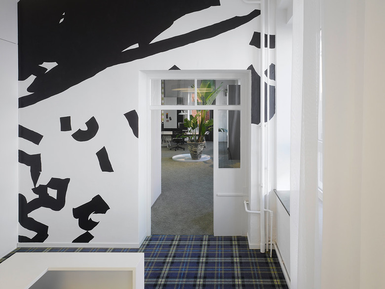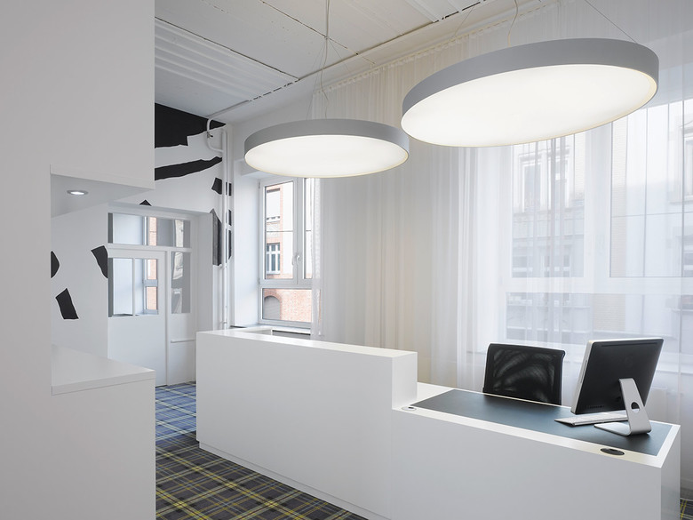 Schon das Betreten der Büroräume wird zur bewussten Inszenierung. Eine schwere Metalltür trennt diese vom nüchternen, gefliesten und eher dunklen Treppenhaus. Umso strahlender erscheint dem Besucher der ganz in Weiß gehaltene Empfangsbereich, in dem dieser zunächst mit einer Arbeit des Künstlers Robert Steng gegenüber der Eingangstür konfrontiert wird. Steng schafft aus gefundenem Holzmaterialien zweidimensionale Objekte, die dreidimensionale Raumperspektiven abbilden. Durch seinen kreativen Umgang mit den Themen Re-Use und Raumanalyse findet er die passende künstlerische Position für wichtige Arbeitsprinzipien des Studios. In die weiße Eingangswelt fügt sich der kubische Tresen nahtlos ein, den zwei große Leuchtteller zusätzlich verorten. Den eher reduzierten Charakter dieses Bereich brechen zwei Elemente auf. Sozusagen als Wegweiser in Richtung Kreativabteilung dient die abstrakte Wandgrafik am Durchgang zum Studio. Im auffälligen Kontrast zum Weiß der Wände steht der Boden mit dem violetten Teppich, der ein selbst entworfenes Karomuster zeigt. Der präzisen Klarheit des Empfangs verleiht er zusätzlich ein weiches, wohnliches Ambiente.