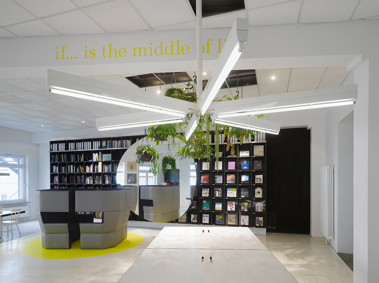 Für Entspannung wird aber auch im Inneren gesorgt. Während das Studio ein Ort mit konzentrierter Arbeitsatmosphäre ist, steht der sich anschließende Salon ganz im Zeichen von Kommunikation und Inspiration. Letztere holt man sich unter anderem aus den Zeitschriften und Büchern der Bibliothek, die in einem wandfüllenden Regal untergebracht ist und vor dem ein großer, dreiflügeliger Spiegel hängt, der sich zur Seite schieben lässt. Vor dem Regal steht eine gepolsterte Leseinsel, die gern für intime Gespräche und Telefonate genutzt wird. Wichtigster Ort des Raumes ist jedoch die Küche, der viel Bedeutung, und deshalb auch Raum zugemessen wird – eine Erfahrung, die das Büro bereits bei zahlreichen Wohnprojekten ausgezeichnet hat. Die offene Küche steht orthogonal zur Fensterfront, entlang der sich eine lange Tafel erstreckt. Diese erfreut sich nicht nur mittags reger Benutzung, sondern hier finden auch Cook-Ins mit Kunden und größere Besprechungsrunden statt. Einen weiteren Bereich des Salons nimmt ein großer Projekttisch ein, der mit Materialsammlungen und Collagen den Ideenpool für laufende Projekte bildet. Darüber geben eine sternförmige Leuchtstoffröhrenlampe optimales Licht für Gedankenblitze und von der Decke hängende Grünpflanzen das Gefühl, mit einem Problem nie allein zu sein.