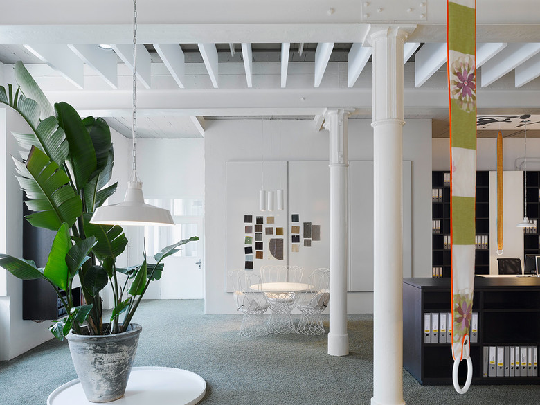 Ein wichtiger Punkt der Arbeit des Büros ist die Beschäftigung mit Materialien. Dem trägt eine große Regalwand mit der Materialbibliothek Rechnung, die den Raum zur einen Seite hin abschließt. Die Muster für die einzelnen Projekte werden gern auf dem langgestreckten Mittelregal entlang der zentralen Achse ausgelegt. In Kombination mit den hier gezeigten Skizzen, Renderings und Plänen wird dieses zur permanenten Präsentationsfläche und Gradmesser für den temporären Stand der Arbeiten. Hinter der Regalwand erstreckt sich das Backoffice mit Werkstatt, Druckstation und Archiv. Rechts von der Materialbibliothek führt eine Tür zur Mitarbeitertoilette, an deren Wänden großformatige Illustrationen die Motive der Deckenteppiche wieder aufgreifen. Hier wurde außerdem ein Durchbruch ins Freie geschaffen, wo eine Terrasse unter einem großen, alten Kirschbaum Asyl für die Raucher und die Chance für kleine Fluchten hinaus in die „Natur“ bietet.