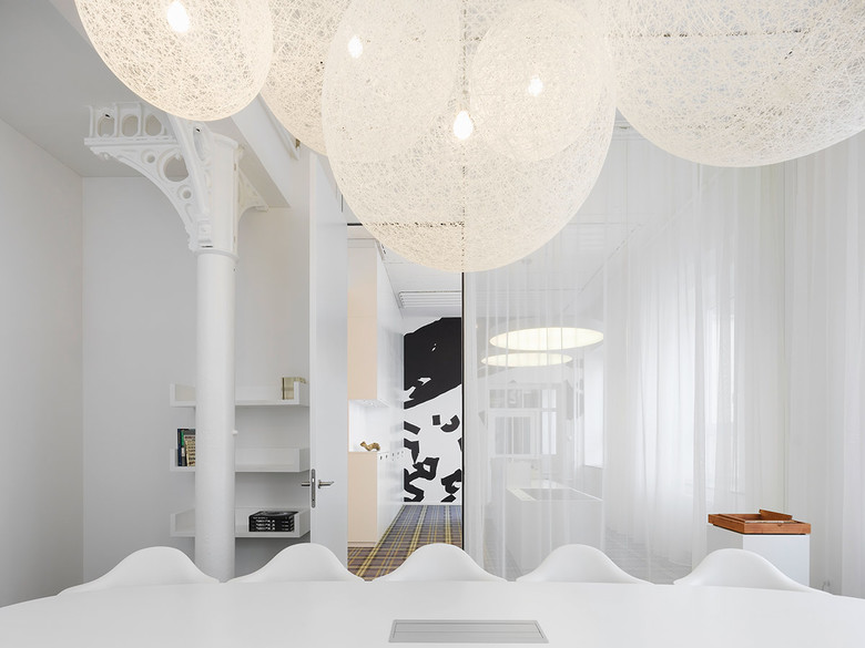 Durch eine Glasscheibe getrennt schließt sich an den Empfang der große Besprechungsraum an. Hohe Fenster an zwei Seitenwänden sorgen für viel Tageslicht, dass durch weiße Vorhänge gefiltert wird. Über dem ovalen Besprechungstisch schwebt eine Wolke aus filigranen, kugelförmigen Leuchten. Eine Gusseisenstütze, die offen verlaufenden Versorgungsleitungen und die Bestandsdecke sind lediglich weiß gestrichen, sodass auch hier der Charme der einstigen Industriearchitektur erhalten bleibt. Der sich anschließende kleine Besprechungsraum ist dann das genaue Gegenteil und dient für intime, konzentrierte Gespräche: Im Zentrum des in einem tiefdunklen Violett gehaltenen Raums steht ein runder weißer Tisch, über dem eine überdimensionale Leuchtglocke schwebt. Seine Wände sind raumhoch mit einem Raster aus gerahmten Projektbildern überzogen. Das darauffolgende Gäste-WC überrascht mit einem Fenster, das sich einst in den Erweiterungsbau öffnete und jetzt verspiegelt und hinterleuchtet neue Einsichten bietet.