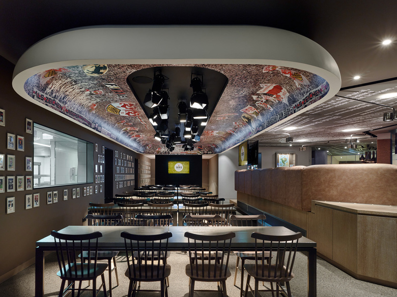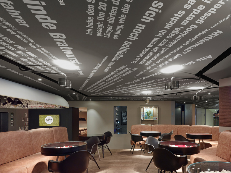Das »1893« sollte einerseits als Anlaufstelle für die Fans nach dem Spiel oder zum gemeinsamen Fußball schauen im TV werden, und sich andererseits mit seinem Anspruch an die Küche auch als kulinarische Adresse etablieren. Die Aufgabe wird durch eine präzise Zonierung mit atmosphärisch ganz unterschiedlichen Bereichen gelöst. Das Leitthema, die Vereinsgeschichte, steht dabei über allen Räumen und wird mit unterschiedlichen Mitteln – von Autogrammkarten über Vereinsdevotionalien bis zur Deckengrafik aus Spielerzitaten – erzählt.
