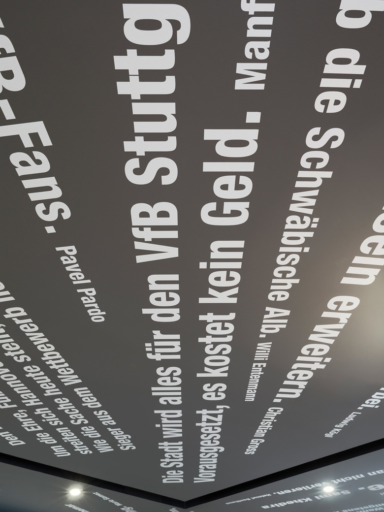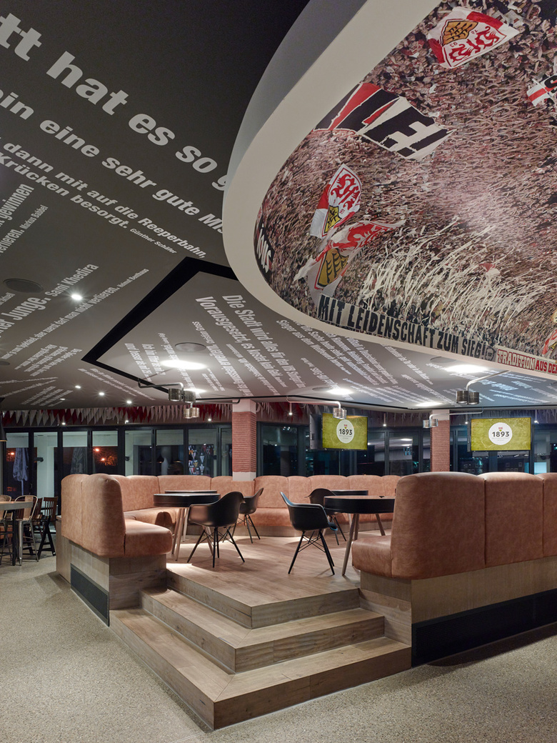 Gegenüber dem Eingang steht ein Empfangspult hinter dem sich, getrennt durch einen Filter aus Holzlamellen, ein langer hoher Tisch mit Barhockern befindet. Offen, ungezwungen und kommunikativ ist auch die Atmosphäre im Barbereich daneben. Eine Glasdecke sorgt hier für Tageslicht, die Wände sind unprätentiös mit dunkel gestrichenen Holzwolleplatten verkleidet. Sie dienen zugleich als interaktives Raumelement: Die Fanclubs dürfen hier mit ihren Vereinswimpeln ihre Verbundenheit mit dem VfB zeigen. Hinter der Bar liegt ein eher privater, zurückgezogener Raum mit einem ovalen „Stammtisch“. In der Wand dazwischen ist eine Vitrine für Wechselausstellungen zur Vereinsgeschichte eingelassen, deren Exponate die Geschichten aus der aktuellen Stadionzeitung weitererzählen.