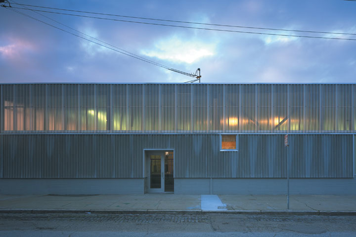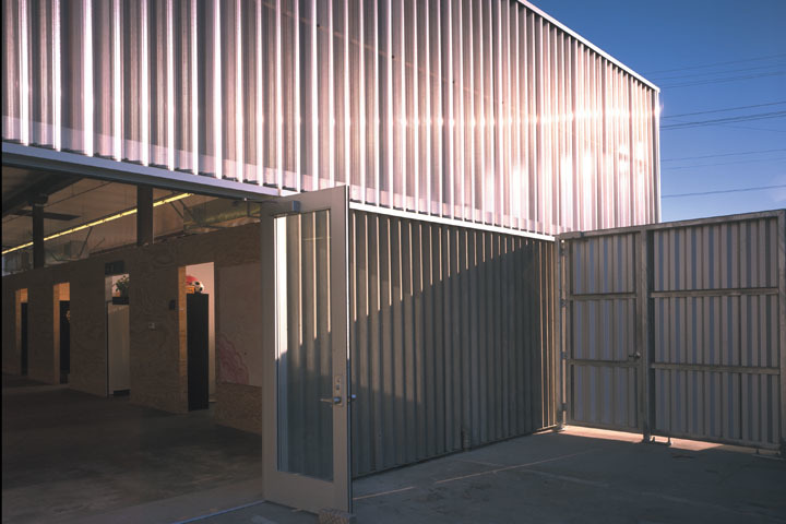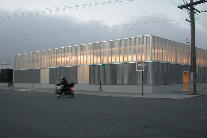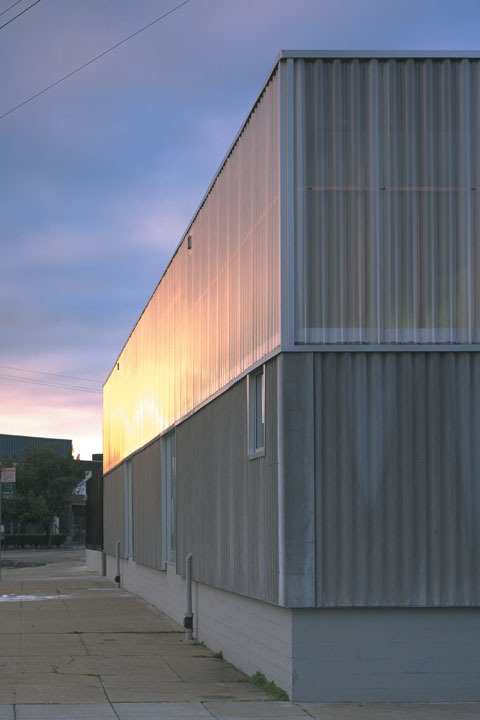 A 10,000 square foot, wood-framed warehouse is creatively and economically transformed into new facilities for the growing Graduate Studies Program at the California College of the Arts. Along with seismic and accessibility upgrades to the building, its exterior is entirely re-clad in corrugated cement-board with a continuous clerestory of corrugated twin-wall polycarbonate. A mobile shipping container in the exterior courtyard houses new prefabricated restrooms, allowing the interior space to be devoted entirely to thirty-two individual light-filled artist studios.