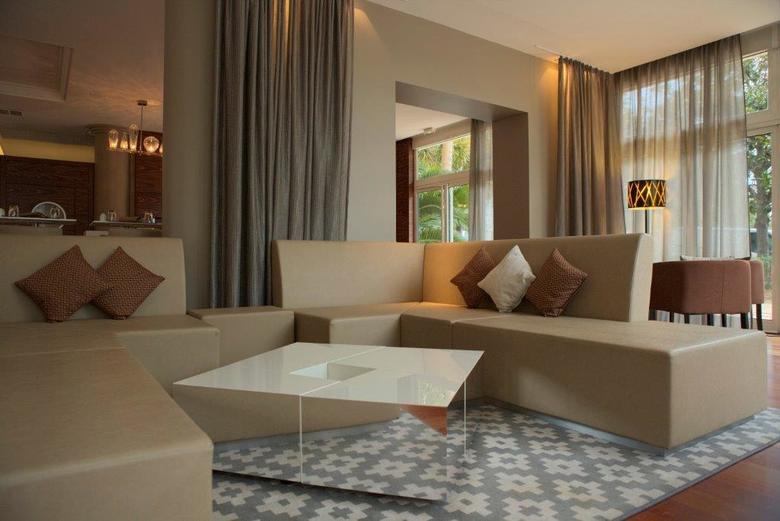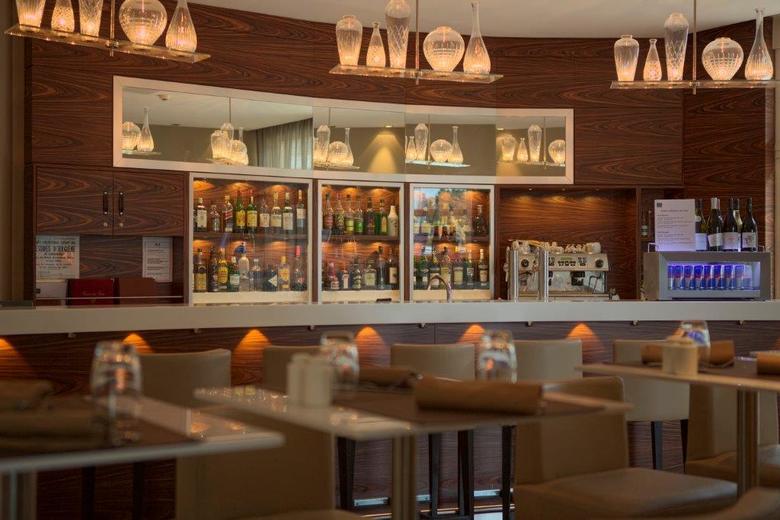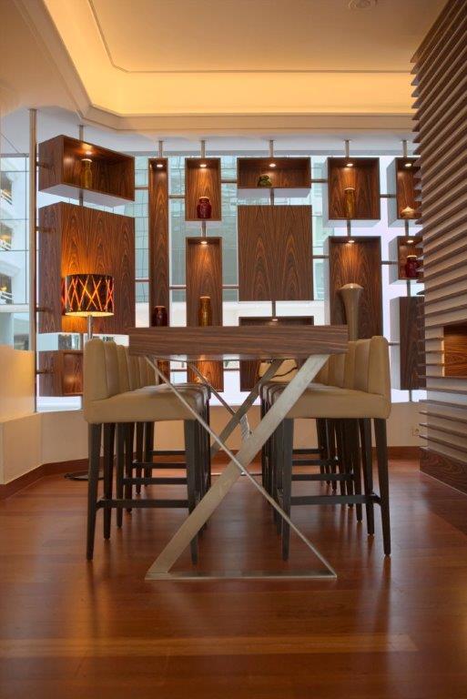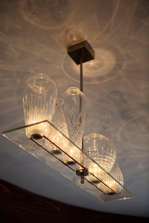 Diese Bar „funktioniert“ und wird allen Bedürfnissen gerecht, da sie mit verschiedenen Sitzqualitäten und –höhen sowie einem geschickten Lichtkonzept Raum für alle Gelegenheiten bietet und dadurch einladend auf Business- und eben auch die Leisure-Gäste wirkt. Individuelle Design-Details verleihen der Bar die dazu nötige Atmosphäre. Als Eyecatcher mit regionalem Esprit fallen zum Beispiel die Hängeleuchten über dem Bartresen ins Auge, bestehend aus verschiedenen leicht verspielten Kristallglas-Flakons, die vor allem in den Abendstunden einen dezenten gelb-goldenen Schimmer verbreiten. Durch das Zusammenspiel mit modernen geradlinigen Elementen, wie dem vierteiligen Tisch im Lounge-Bereich der Bar mit glatter und hochglänzender Oberfläche oder der Stehleuchte mit einem Gräser-Motiv im Lampenschirm, unterstreichen das erstklassige jedoch unaufdringliche Design.