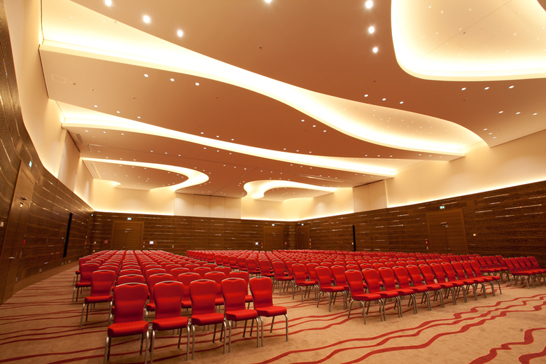 Für Veranstaltungen von bis zu 570 Personen wartet der Ballsaal "The Globe" auf Besucher. Konzipiert als Haus im Haus spielt er in seiner organischen Form auf die Architektur des THE SQUAIRE an, und auch seine silbrige Hülle aus Glasmosaik reflektiert das Licht ähnlich effektvoll wie das Äußere des Gebäudes. Strahlend geht es im Inneren weiter. In die Wände eingelegte Swarovski-Kristalle, die wie Leuchtstreifen durch den Raum zu "blitzen" scheinen, sorgen zusammen mit den wellenförmigen Lichtvouten in der Decke für mehr als beeindruckende Lichteffekte. Natürlich kann der Saal auch für größere (oder geteilt für kleinere) Business-Meetings in Anspruch genommen werden, wobei zusätzlich diverse Konferenzräume auf der Lobby-Ebene zur Verfügung stehen. Auf Gäste der Executive Zimmer wartet in Ebene zehn zudem die mit vielen Features ausgestattete "Executive Lounge". Computer lassen sich hier unsichtbar in den großzügigen Empfangstischen versenken, deren edle, dunkelbraune Oberfläche aus Nussbaum einen idealen Kontrast zu den hellen Lamellen-Fronten bildet – wieder eine kleine Hommage an die dynamische Außenhaut des Gebäudes. Im Gegensatz dazu haben die Lamellen bei den freistehenden Sitznischen aus hellem Leder einen behaglichen "Cocooning-Effekt". An diesem Ort lässt es sich ungestört, abgeschirmt arbeiten. Natürlich können Gäste sich ebenso in eine der gemütlichen Lounge-Bereiche oder in die Bibliothek zurückziehen, wo man in den komfortablen hellen Ledersesseln auch entspannt auf einen verspäteten Flug warten kann. Falls der Flieger doch früher gehen sollte, wartet ein early-bird Frühstück im Buffetbereich - mit ihrem belebenden, leuchtenden Pink vertreibt die Beleuchtung hier etwaige Müdigkeit sofort auf angenehme Art.