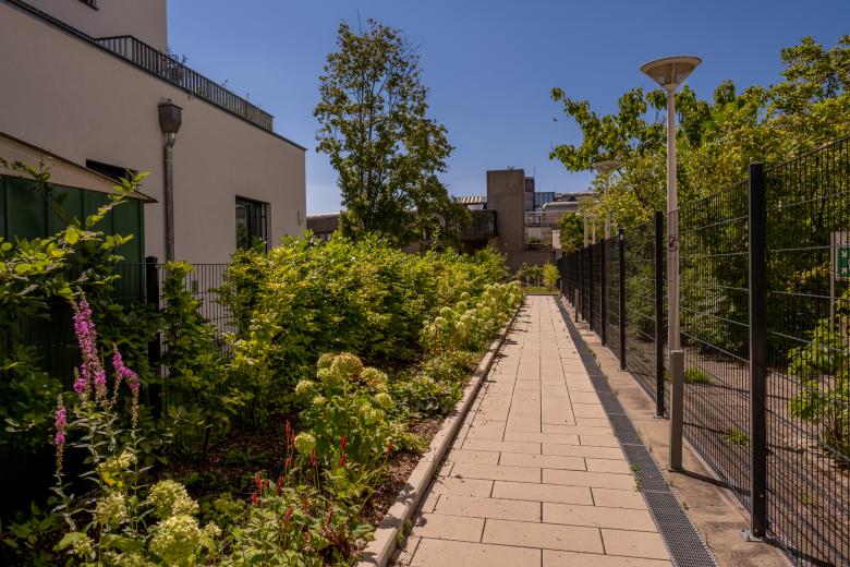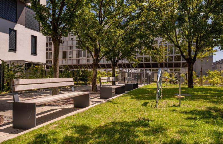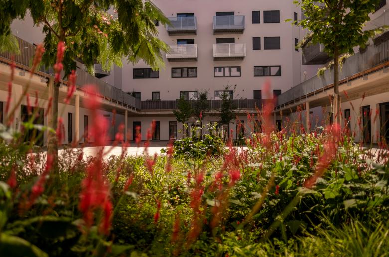 Ein Kindergarten mit Freiflächen wurde integriert. Erst ab dem 2. Geschoß wird das Gebäude für Wohnen genutzt. In der Mitte befindet sich ein großzügiger Innenhof, der mit Bäumen und vielfältigen Stauden neu bepflanzt wurde. Die innenliegenden Wohnungen profitieren von dieser ruhigen Oase. Die nach außen – zur Althanstraße – orientierten Wohnungen verfügen im 2. OG über Eigengärten, die durch außenliegende Hecken und Pflanzstreifen als Grünpuffer von den „öffentlichen“ Bereichen geschützt sind.