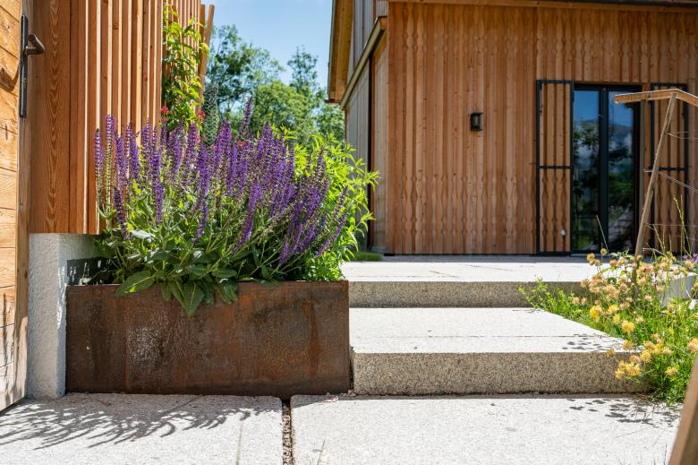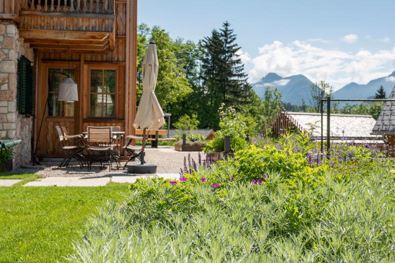 Der alte Obstbaumbestand mit seinen traditionellen Sorten wurde um neue Sorten und Nussbäume erweitert. In der Nähe des Feldkastens wurde ein Naschgarten mit verschiedenen Beeren angelegt. Vor dem Haupthaus befindet sich ein "Dorfplatzl", an dem sich die Gäste an einem großen Tisch unter einer Linde treffen können. Der Bodenbelag besteht aus durchlässigem Kalkschotter, der natürlicherweise im Ausseerland vorkommt. In frequentierten Bereichen wie Sitzplätzen und Zugängen wurden Natursteinplatten in den Kalkschotter verlegt. Das Haupthaus wird von duftenden Stauden begleitet, die in Farbe, Höhe und Blühzeit harmonisch aufeinander abgestimmt sind. Prächtige Rosen und Hortensien ergänzen diese Bepflanzung. Bei der Auswahl der Pflanzen wurde darauf geachtet, dass sie den klimatischen Bedingungen entsprechen und von Frühjahr bis Herbst unterschiedliche Blühphasen aufweisen.