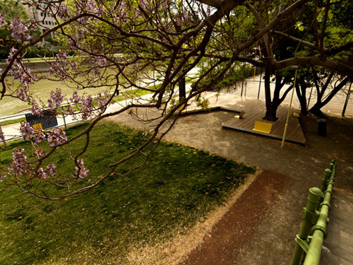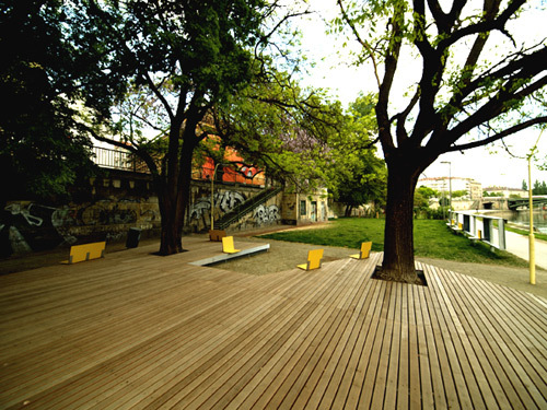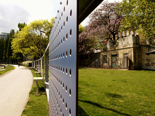 Der Donaukanal als städtischer Freiraum im Zentrum von Wien hat einen begleitenden weitgehend ungenutzen Grünstreifen. Die StreetworkerInnen wandten sich mit ihren Anliegen an die Baudirektion Wien. Unser Planungsteam hatte die Aufgabe mit Jugendlichen einen Partizipationsprozess durchzuführen. In einem Planungsworkshop wurde der Jugendfreiraum als solcher definiert und passende Ausstattungselemente zum Sitzen, Liegen, Plaudern, Beobachten, Treffen, Bewegen entworfen. Die Liege-Sitzplattform aus Lärchenholz unter dem Altbestand großer Laubbäume hat Lehnen aus Compactfoamingplatten und dient zum Relaxen. Der Zaun mit beidseitigen Sitzelementen trägt mehrere Funktionen: Jene Sitzelemente zur Grünfläche sind zum Zuschauen und für Rückzugsmöglichkeit und jene Sitzelemente zum Donaukanal sind für das Beobachten und Sonnen. Die Sitz- und Zaunelemente sind aus einem Stahlrahmen mit Kompaktplatten. Die Platten sind Flächen für Graffiti Bemalungen, die bereits in den ersten Wochen künstlerisch gestaltet wurden. Die Rasenfläche hat die Größe eines Volleyballfeldes - ein Volleyballnetz kann optional aufgestellt werden.