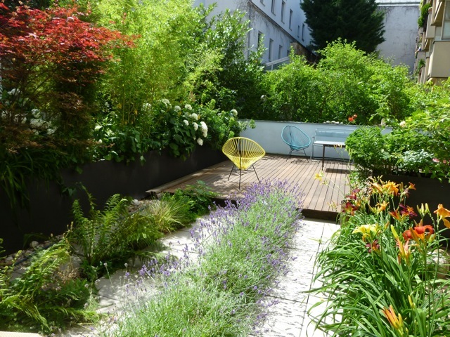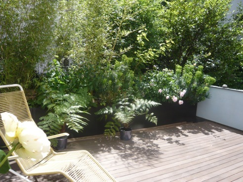 Eine Gemeinschaftsterrasse und der Wunsch nach einem eigenen Wohnzimmer im Freien war der Ausgangspunkt für eine gemeinsame Aktion einiger Anwohner in der Wiener Badhausgasse. Pflanztröge aus Cortenstahl teilen nun die gepflasterte und mit Bankirai-Holz ausgelegte Fläche. In den 15 Meter langen Cortenstahl-Tröge wächst Bambus als immergrüner Sichtschutz. Zierfenchel, Wolfsmilch, Taglilien, Schwertlilien und Rosen bringen Farbtupfer in die grünen Wände. Die witterungsbeständige Stahl-Oberfläche der Pflanzbehälter oxidiert, das Rostrot sorgt für interessante Kontraste mit den unterschiedlichen Grüntönen. Nur bei einer Parzelle konserviert Leinöl die ursprüngliche dunkelgraue Oberfläche. Garagenlüftungen verschwinden hinter Gabionen. So entstehen Steinwürfel, die unterschiedlich genutzt werden können: als Wasserfläche, Tisch oder weiterer Pflanzcontainer. Text:  Peter Zöch