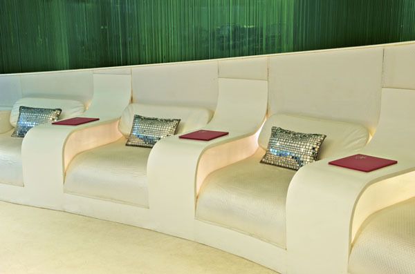 In the circular relaxation area comfortable loungers are divided by sheer white curtains bathed in preprogrammed washes of LED light. Reflecting VIBGYOR colours, the sheer fabric assists in Chromotherapy.