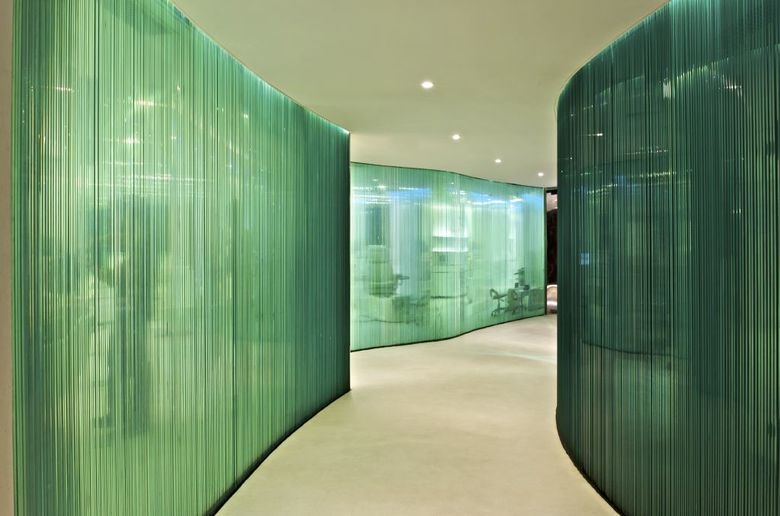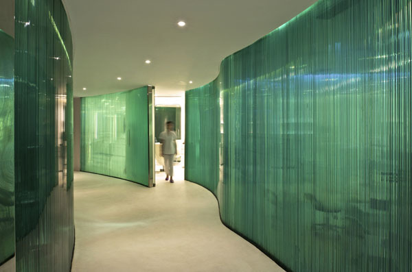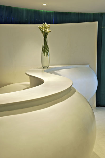 The entrance curved corridor walls of the Spa were built out of edge polished vertically stacked glass, leading to a circular reception area with a fluid reception counter and relaxed customer seating sheathed in moulded white resin. A wooden staircase from the pool level also descends into the central womb like reception zone. The stacked glass walls glow from within with LED light giving the surrounding spaces a feeling of lightness.
