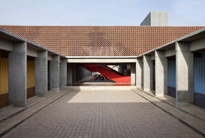 Other contextual references are in the vernacular terracotta jaalis (shading and ventilation screens used traditionally in India) that wrap around parts of the building and are included on both sides of each classroom to facilitate adequate cross ventilation from NE to SW. The jaalis cut down the sun especially on the western face of the building where we have effectively used them in breakout areas.
