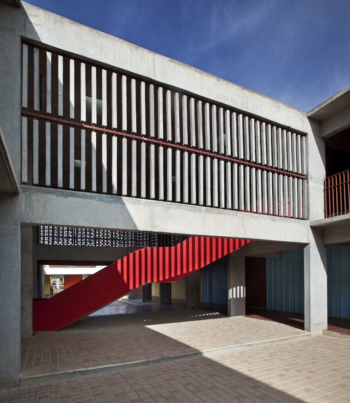 The central linear open-to –sky court that runs the entire length of the building is the soul of the school and facilitates learning outside the classroom. The temperate climate of Bangalore allows for open to sky discussion on benches surrounding the courtyard trees or on the steps of the corridors.