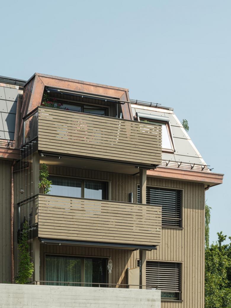 Um die Baumasse optimal ausnutzen zu können, wurde das Dach als Mansardendach ausgebildet. Auf diese Weise konnte das Dachgeschoss voll ausgenutzt werden und es entstanden attraktive Dachgeschosswohnungen mit hohen Räumen und einer sichtbaren Holzkonstruktion. Zudem wurde fast die gesamte Dachfläche mit Inroof PV-Modulen ausgestattet.