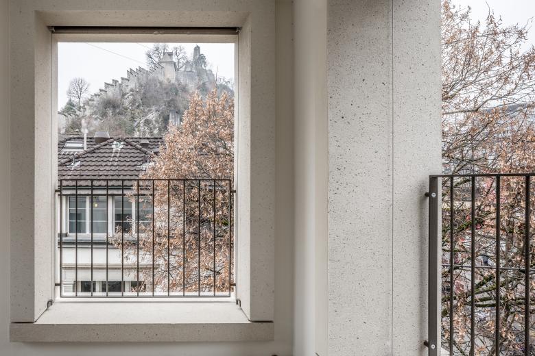 Der Eingliederung zu den benachbarten denkmalgeschützten Bauwerken wurde grosse Beachtung geschenkt. In diesem geschichtlich sensiblen Umfeld gilt es, die aus denkmalpflegerischer Sicht wertvollen Nachbarhäuser wie das Bölsterlihaus aus den frühen 1950er-Jahren und das spätklassizistische Wohnhaus am Schlossbergplatz 2 (Baujahr 1863) zu beachten. Auch der Stadtturm in seiner Erscheinung als Wahrzeichen Badens darf nicht beeinträchtigt werden.