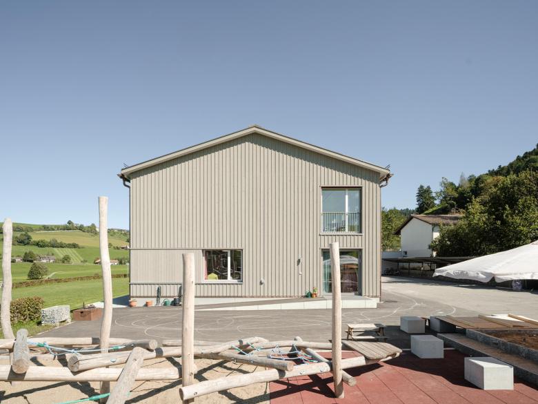 Mit Rücksichtnahme auf die ländliche Umgebung entstand ein Neubau in Holzbauweise. Die Holzfassade spielt mit einer Nut-/Kammverschalung sowie einer Bretterschalung mit Leistendeckung. Damit entsteht im Rhythmus von Fenster- und Brüstungsbändern eine reliefartig verspielte Fassade. Diese bewusste Differenzierung zum verputzten Altbau lässt die Erweiterung volumetrisch gut erkennen. Der Zwischentrakt wird durch eine grossflächige Verglasung erkennbar und bildet eine Zäsur der beiden Schultrakte.