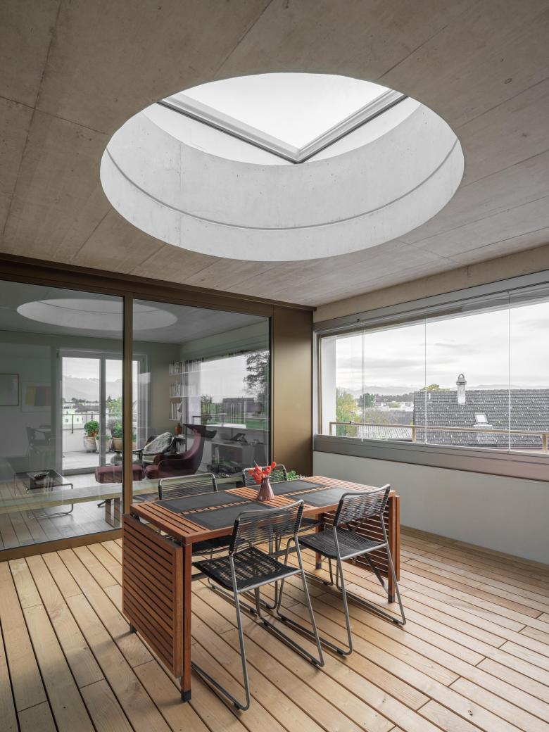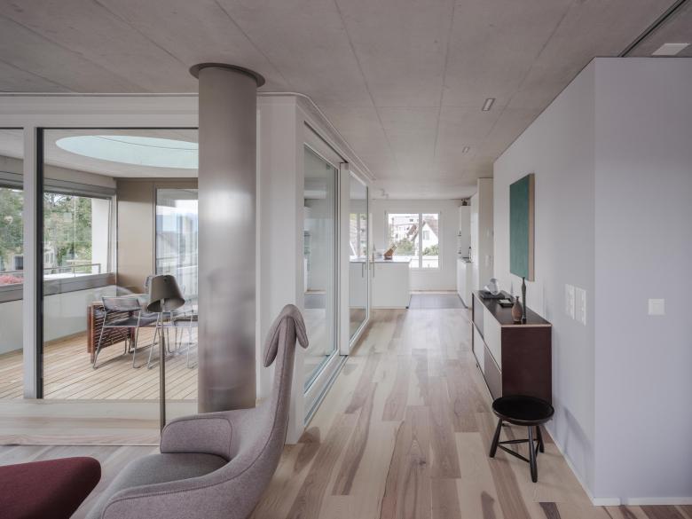 Bereits beim Betreten des Grundstückes wird das kleine feine Mehrfamilienhaus erlebbar. Der mit Hecken umrahmte Vorgarten markiert die nötige Privatsphäre der Liegenschaft. Das räumlich grosszügige Treppenhaus, ausgestattet mit warmen Materialien und einer subtilen Lichtgestaltung empfängt die Ankommenden bereits mit viel Wohnlichkeit. Die innere Erschliessung der fünf Geschosswohnungen und die Raumfolge gewährt in unterschiedlichen Varianten freie Durchblicke und Ausblicke auf die Berge und schafft dadurch eine wohltuende Grosszügigkeit.