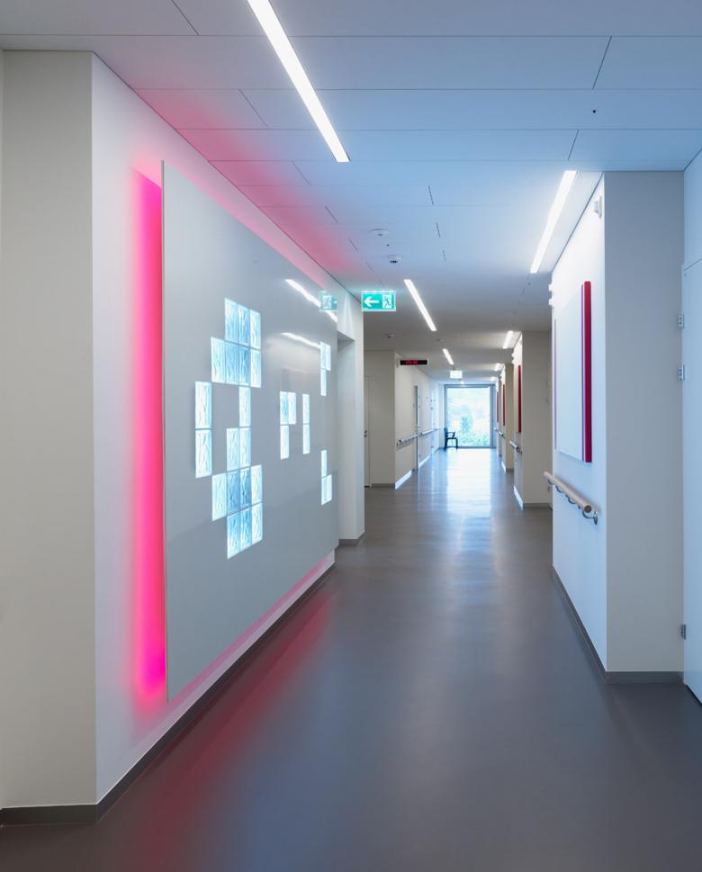 Das Zusammenspiel der Architektur mit den am Bau integrierten Lichtzeichen, Farben und Formen der Künstlerin Marguerite Hersberger verleihen dem Gebäude eine unverkennbare Identität.