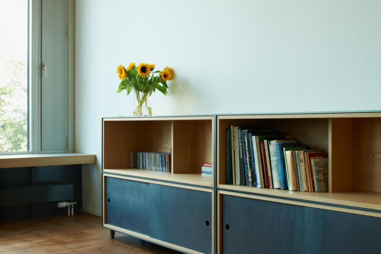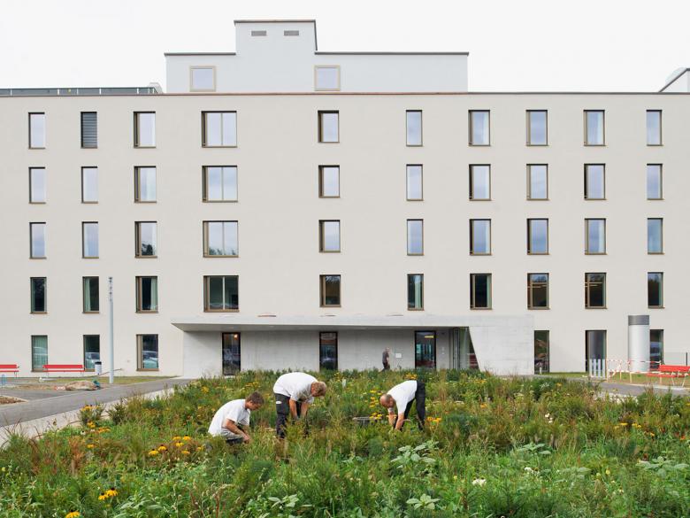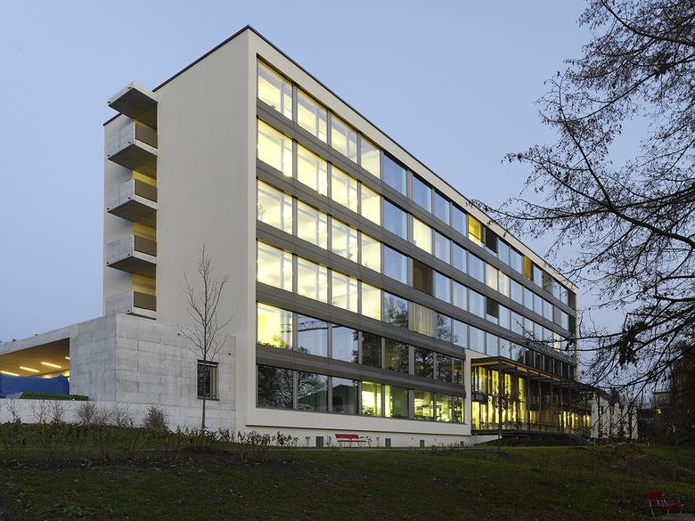 Der talseitig sechsgeschossige Bau aus den siebziger Jahren wird auf sein einfaches quaderförmiges Grundvolumen zurückgebaut. Ergänzende Neubauteile sollen entsprechend dem vorhandenen Gebäudequerschnitt angefügt werden und die nötigen Infrastrukturräume beherbergen. Die einheitliche neue Fassadengestaltung über Alt- und Neubauteile unterstützt das klare Volumen. Sie orientiert sich an einer zeitgemässen Architektursprache. Der nüchternen vorhandenen Raumstimmung setzen wir warme Materialien im Innenausbau und gezielte orientierungsstiftende Farbakzente gegenüber.