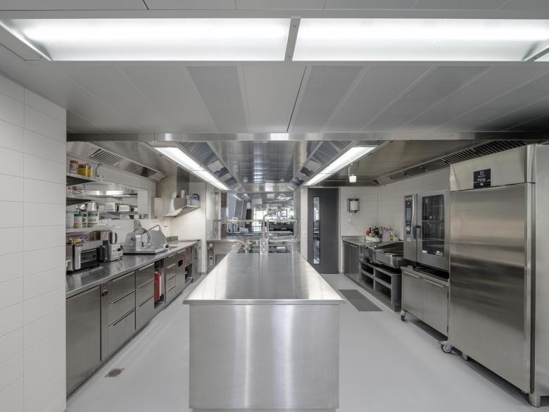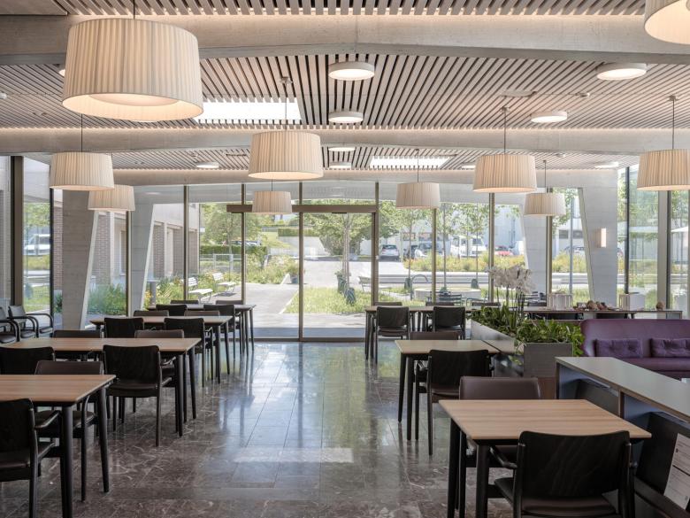 Ein eingeschossiger Pavillonbau, welcher sich an das heutige Foyer im Erdgeschoss niveaugleich andockt, beherbergt das neue Restaurant für Bewohnende und weiteres Publikum.