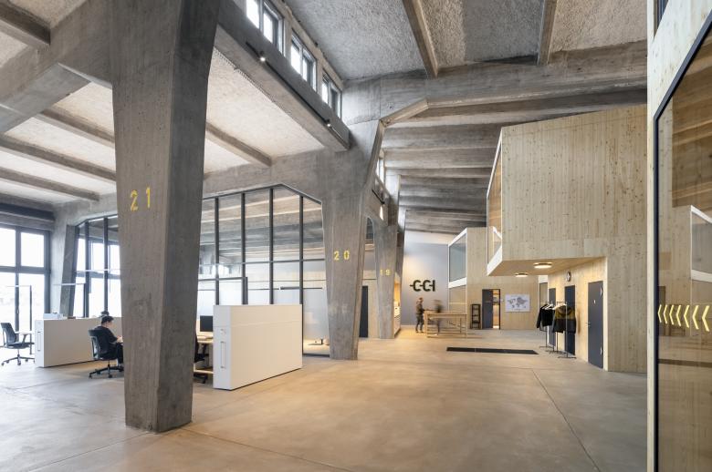 Die Holz-Kuben erhöhen die Ausnutzung der Bestandsfläche und schonen Oberflächenversiegelung. Das warme Holz und der Bestand ergeben eine großartige Symbiose aus Historie und Zukunft. Eine praktische und ästhetische Lösung, um die verschiedenen Funktionsbereiche innerhalb des Zentrums herzustellen. Neue Treppenräume und Freitreppen verbinden die Ebenen und laden zum Verweilen oder Kommunizieren ein. Im Sinne einer flexiblen Nachnutzung können die Mieteinheiten durch die Moduleinbauten jederzeit erweitert oder verkleinert werden.