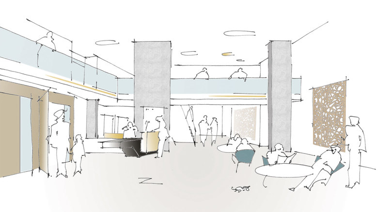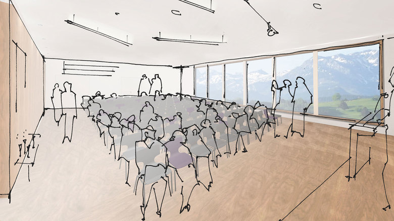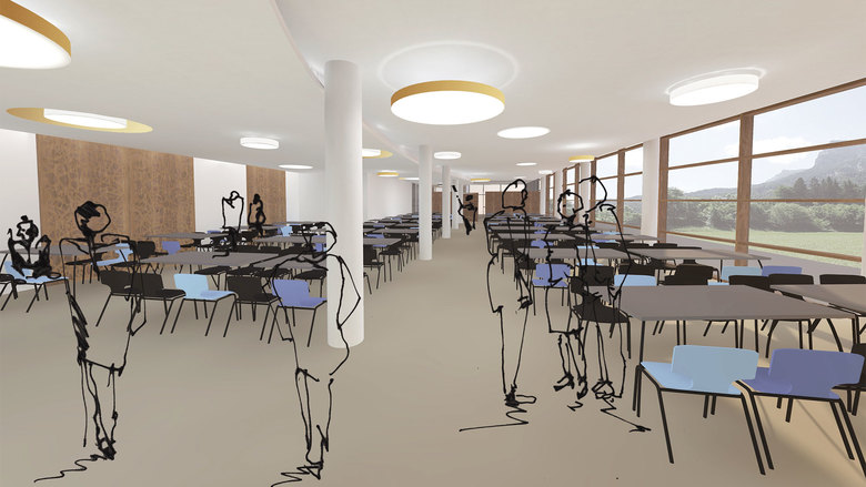 Das bestehende Klinikgebäude liegt direkt an der Hauptstraße in Bad Reichenhall. Der Neubau auf dem benachbarten Grundstück steht an prominenter Stelle direkt gegenüber dem Bahnhof und ist im 2.OG über ein Brückenbauwerk an den Bestand angebunden. Der Neubau soll eine repräsentative, der neuen Klinikgröße angemessene, großzügige und übersichtliche Haupteingangssituation schaffen. Im zentral gelegenen 4-geschossigen Atrium befindet sich die vertikale Haupterschließung des Gebäudes mit Treppen- und Liftanlagen. Die beiden Patientenzimmerflügel sind von der Straßenseite abgewandt rückseitig orientiert und um hochwertige Gemeinschafts- und Erschließungsbereiche angeordnet. Auf eine klare Trennung von Behandlungsräumen und Patientenzimmern wurde geachtet. Es werden insgesamt 51 Patientenzimmer realisiert, überwiegend Doppelzimmer ergänzt von Einzel- und Rollstuhlzimmern. Das Atrium sorgt für ein lichtdurchflutetes Gebäudeinneres mit vielfältigen abwechslungsreichen Wegeverbindungen. Durch den geschossübergreifenden Luftraum ergeben sich vertikale Blickbeziehungen und Orte für Begegnung, Kommunikation und zum Verweilen. Der Neubau übernimmt in diesem Bereich verstärkt Kompensationsmaßnahmen für die fehlenden Qualitäten der Altbauten. Bei der Anordnung der Räume wurde auf zahlreiche, verschiedenartige Blickrichtungen auf das ringsum beeindruckende Alpenpanorama Wert gelegt. Über der Eingangsfassade wird ein auskragender Saalbaukörper angeordnet, der einen großen Besprechungs- und Veranstaltungsraum beinhaltet.
