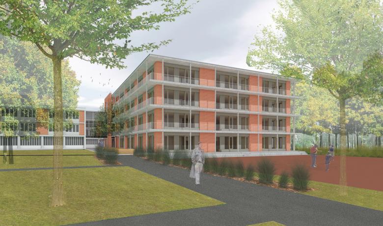 Die Neubauten nehmen das durch den Bestand geprägte Materialkonzept mit Klinkerfassade und in Teilen Sichtbetonelemente auf, und ergänzen damit das architektonische Ensemble der Gymnasien in sinnfälliger Weise.