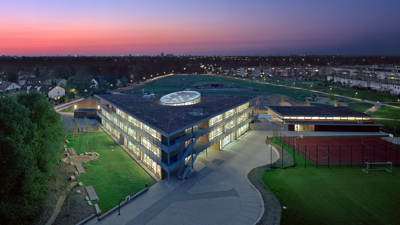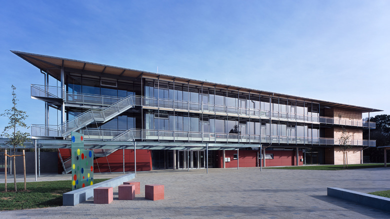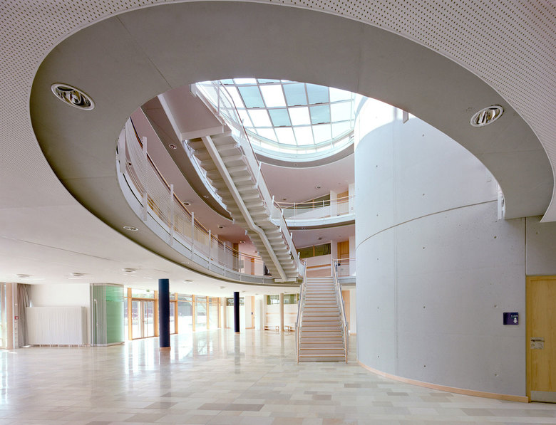 Der dreigeschossige Baukörper in der Form eines gleichseitigen Dreiecks ist eine klare, identitätsstiftende Form. Die Klassen gruppieren sich an den drei Außenseiten und bilden im Innern eine großzügige, zentrale Pausenhalle. Es entsteht ein dreigeschossiger Luftraum als Mittelpunkt der Schule, eine dreidimensionale Bühne zum Sehen und Gesehen werden. Das Glasoberlicht als aufgesetzte Rotunde mit seitlichen Lüftungslamellen gewährleistet eine hervorragende Belichtung und Belüftung der Halle. Die Energiegewinnung durch integrierte Fotovoltaik wird am Eingang durch „atmende“ Kunst sichtbar gemacht. Durch den umlaufenden Fluchtbalkon und den außenliegenden Sonnenschutz entsteht ein Auftrieb, der die verbrauchte Luft aus den Räumen herauszieht. Mit einfachen, sparsamen Mitteln wird somit die Raumluftqualität optimiert. Die Sporthalle ist mit der Schule über eine glasgedeckte Pergola verbunden, welche die Eingangsbereiche beider Gebäude verbindet. Somit verfügt die Sporthalle auch über eine externe Erschließung.