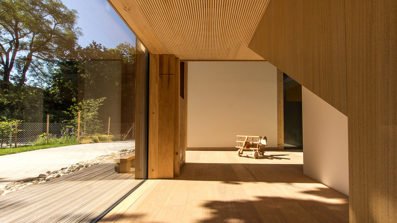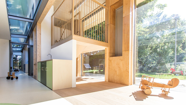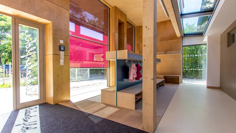Erweiterung der Kinderkrippe „Studentenflöhe“ an der Hochschule Rosenheim in Holzmassivbauweise. Bei der Planungsaufgabe handelte es sich um ein klassisches Projekt aus dem Bereich „Bauen im Bestand“, welches einen respektvollen und sensiblen Umgang mit dem bestehenden Holzbau verlangt. Aus diesem Grund verfolgt das Entwurfskonzept den Ansatz, die Ostfassade mit all ihren Öffnungen zur neuen Innenwand werden zu lassen und die Raumstrukturen des Bestandes aufzunehmen. Ein vier Meter hoher Riegel mit großzügiger Glasfassade stellt sich als Neubau vor das Gebäude und verleiht der Kinderkrippe ein neues Gesicht. Die besondere Herausforderung bei diesem Entwurf war der Anschluss des in Holz-Massivbauweise geplanten Neubaus, an die bestehende Gebäudetypologie. Durch den Versatz der quadratischen Häuser entsteht im hinteren Bereich eine Zone die als Flachdachkonstruktion ausgeführt wurde und eine Raumhöhe von 2,30 Meter aufweist. Die daran anschließende, über die gesamte Gebäudebreite laufende Glasfuge setzt den Neubau nicht nur durch sein Erscheinungsbild, sondern auch baulich vom Bestand ab. Ein weiteres Gestaltungsmerkmal des Riegels sind die großzügigen Glasflächen, die als Fixverglasung ausgeführt wurden. Zur Belüftung dienen die opaken Öffnungsflügel in den Fassadenelementen aus Holz und die Kippfenster im oberen, hinteren Bereich des Riegels. Um jeder Person den Zugang zur Kinderkrippe im gleichen Maße zu ermöglichen, wurde bei der Neugestaltung besonders auf die barrierefreie Ausführung des Baus geachtet.