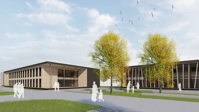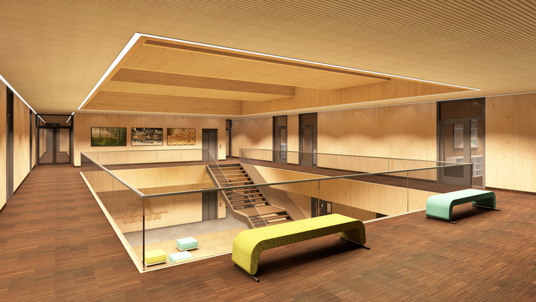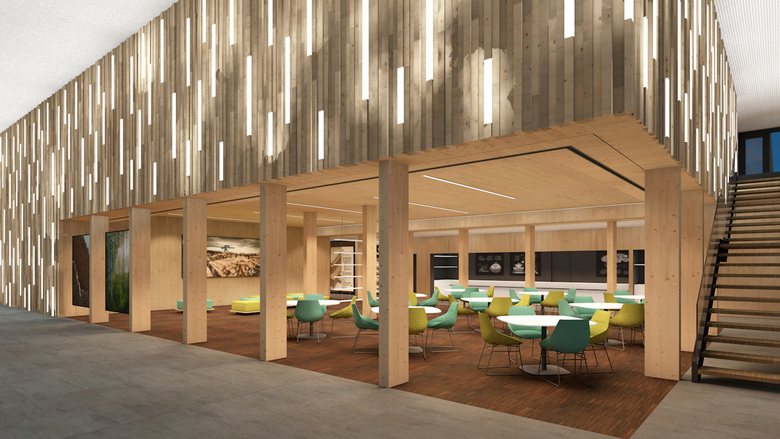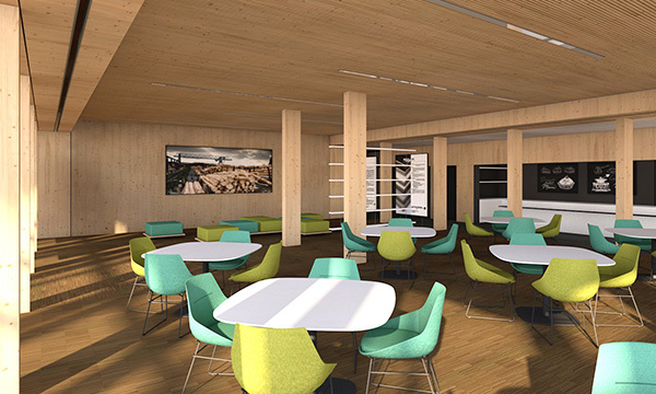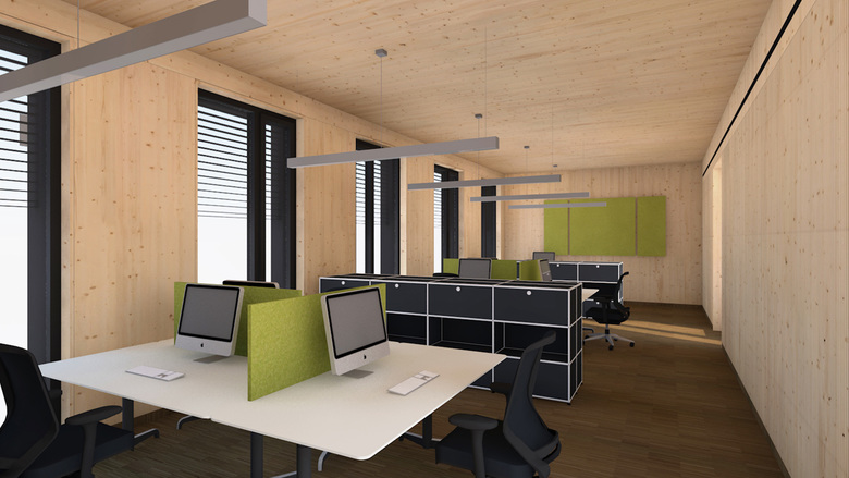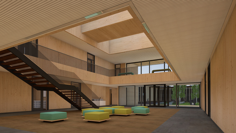Die Neubauten für den lettischen Holzverband und das Bürogebäude für die holzverarbeitende Industrie in Riga bilden ein städtebauliches Ensemble um einen gemeinsamen Vorplatz. Beide Gebäude werden in Massivholzbauweise (Brettsperrholzbauweise) errichtet. Charakteristisch und zugleich konstruktiv schützend sind in beiden Gebäuden die auskragenden Vordachbereiche. Dadurch entstehen bündige und zurückgesetzte Fassadenbereiche, welche auch in der Farbigkeit durch den Hell-Dunkelkontrast differenziert herausgearbeitet werden. Funktional dienen beide Gebäude der Büronutzung, wobei das Verbandsgebäude durch ein Auditorium, einen Snackroom und Ausstellungsbereich zusätzlich auch eine öffentliche, repräsentative Funktion erfüllt. Das L-förmige Verbandsgebäude gliedert sich in einen Büroflügel und ein repräsentativen Kopfbau. Das Gebäude selbst versteht sich als Ausstellungsgegenstand. Diesem Kerngedanken wird im Entwurf durch die rundwegartige Wegeführung Rechnung getragen. Herzstück des öffentlichen Kopfbaus ist die vom Luftraum umschlossene eingestellte „Box“. Diese beherbergt im OG ein Auditorium und im EG einen Ausstellungsbereich mit Snackroom. Das Auditorium ist introvertiert und erhält durch die markante Oberlichtstruktur seinen repräsentativen und einzigartigen Charakter. Äußerlich zeichnet sich das Herzstück als geschlossene Kubatur ab, welche durch die besondere Textur aus Holzlatten und vertikalen Lichtbändern dem Gebäude ein jeweils individuelles Tag- und Nachterschein-ungsbild verleiht. Als weiteres gestaltprägendes Element sei auf die unter dem Vordach des Verbandsgebäudes angeordneten schrägen Rundstützen hingewiesen, welche die Analogie zum Rohmaterial „Baum(-stamm)“ symbolisieren sollen. Das Bürogebäude für die holzverarbeitende Industrie ist ein reiner Verwaltungsbau welcher als direkte Verlängerung an die bestehende Produktionshalle angrenzt. Die Schnittstelle zwischen Bestand und Neubau bildet die 2-geschossige Glasfuge, welche zugleich Eingangsbereich für Mitarbeiter ist. Die Grundstruktur des Gebäudes folgt der eines klassischen 3-Bundes. Die Büroräume sind entlang der Nord- und Südfassade angeordnet. Dazwischen bildet das 2-geschossige stützenfreie Atrium mit Oberlicht das Zentrum des Gebäudes. Im Anschluss daran folgen die Nebenräume.