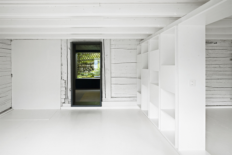 Im Gegensatz dazu ermöglichen die hellen, luftigen Räume klare Gedanken und den Weitblick über den See. Vorgefundene, mehrlagige Tapetenreste wurden durch die präzise Bearbeitung und Freistellung zu kleinen autarken Kunstwerken umgewandelt, zu inszenierten Zeugen der Vergangenheit.