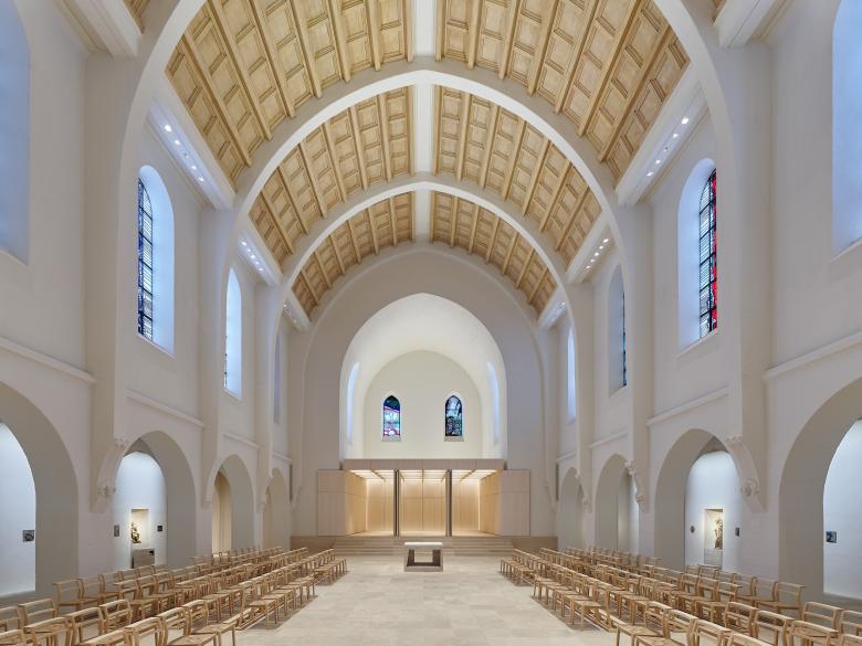 Der Fußboden aus Travertin und die diskrete hölzerne Kassettendecke sorgen für ein einheitliches Befinden. Der Stuttgarter Künstler Martin Bruno Schmid zeichnet für die liturgischen Elemente aus einem einzigen Kalksteinmonolith verantwortlich. Zur unbeschwerten Lichtatmosphäre tragen auch die von Georg Meistermann geschaffenen Farbglasfenster bei. Das Konzept für die künstliche Beleuchtung des Baus stammt vom Studio Lunalicht. In den Nachtstunden wird die Hauptbeleuchtung des Mittelschiffs von Einbauleuchten an den Deckenseiten gewährleistet. Die einzelnen Lichtkegel der quadratisch schwenkbaren Laser Blade XL wurden so ausgerichtet, dass sie am Boden einen gleichmäßigen Lichtteppich erzeugen, der in der Lichtintensität gezielt beeinflusst werden kann.