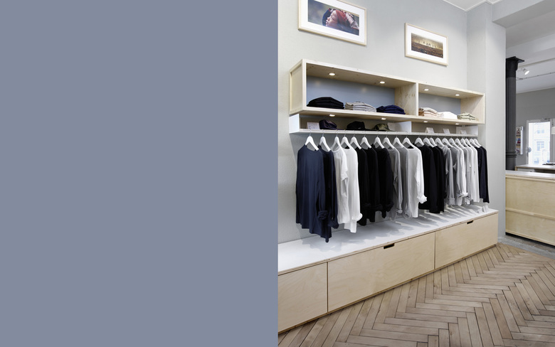 Der Laden befindet sich in einem Gebäude aus dem 19. Jahrhundert, das man durch nachträglich gezogene Zwischendecken und Synthetikböden in eine generische Zelle verwandelt hatte. Das alles haben wir entfernt, um die ursprünglichen Schätze wie den Fischgrätparkettboden und die hohen Decken wieder zum Vorschein zu bringen.